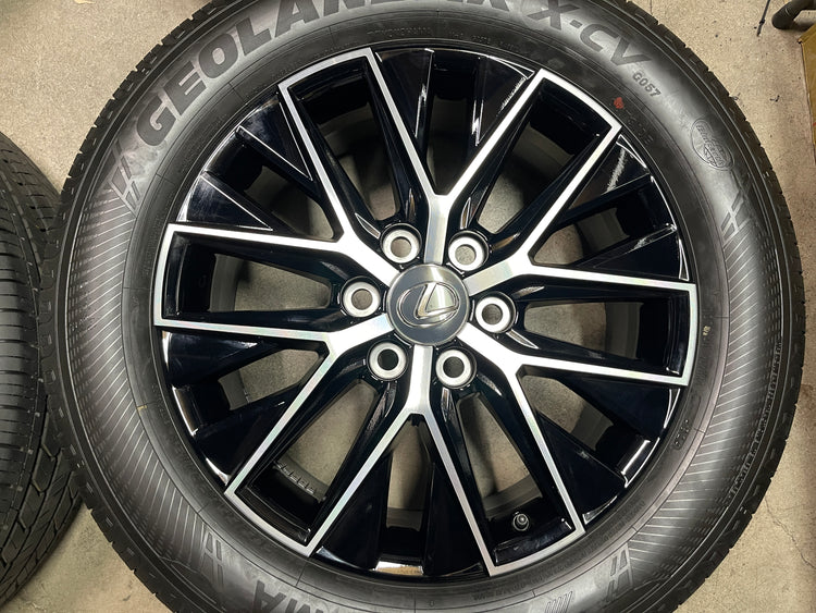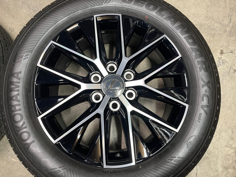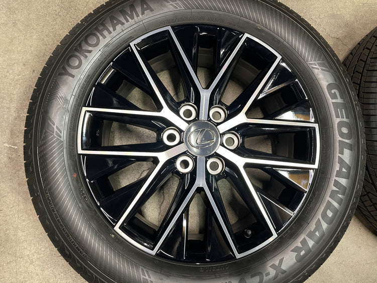 This is a Take-off set of factory 2024 2025 Lexus GX550 20 inch wheels and tires. The Yokohama Geolander X-CV GO57 265/55VR20 have 99% tread remaining and a 4924 DOT. Caps included. No sensors. Note: Bolt Pattern 6x5.5