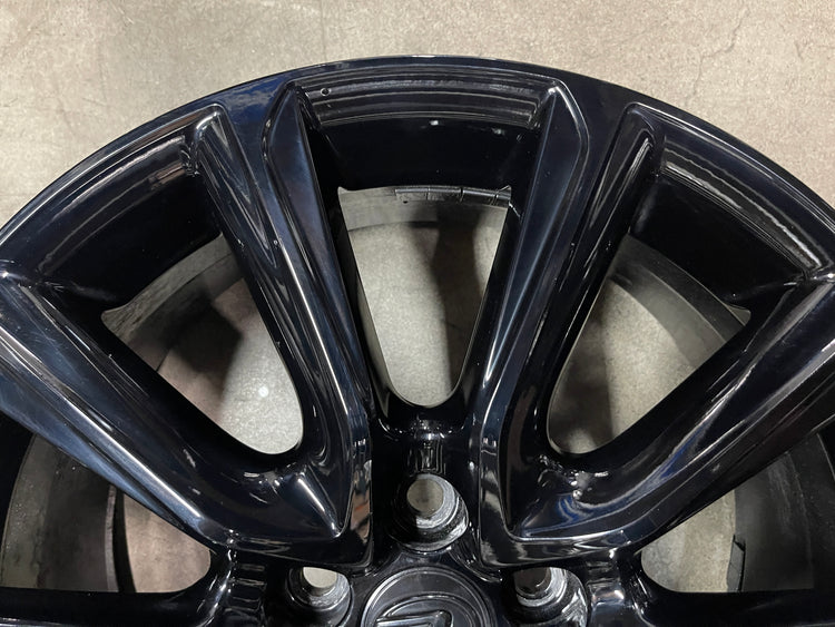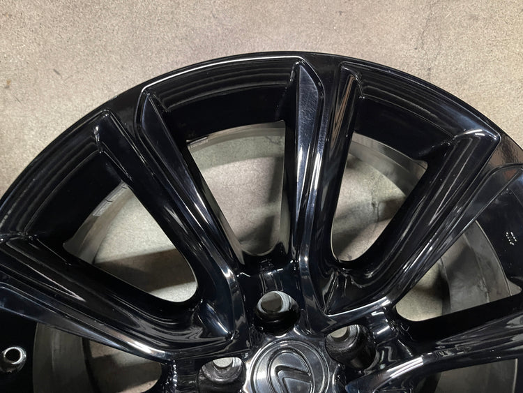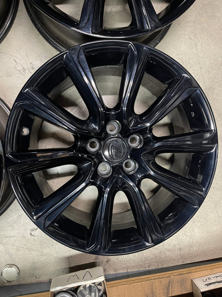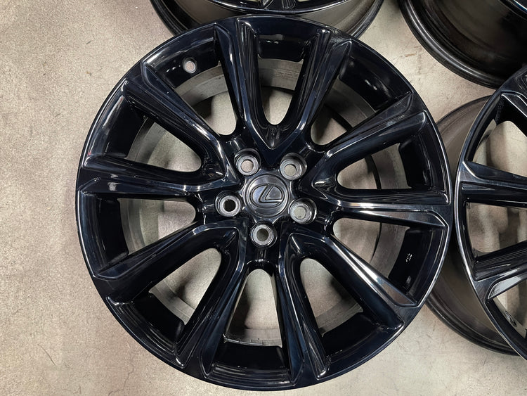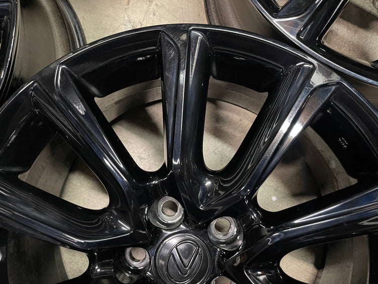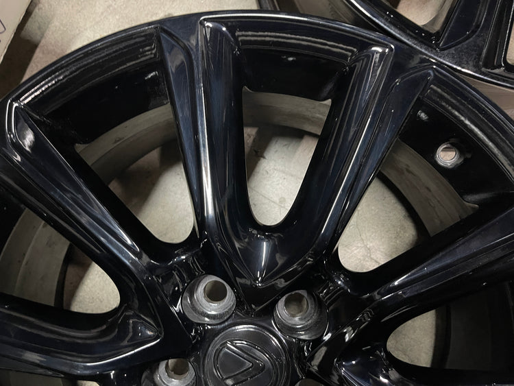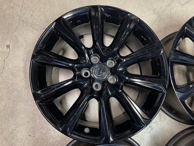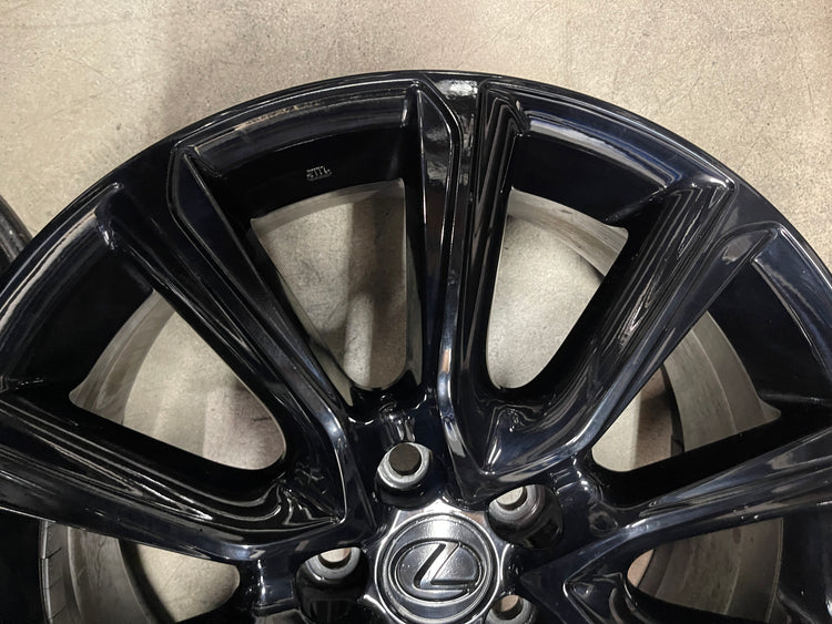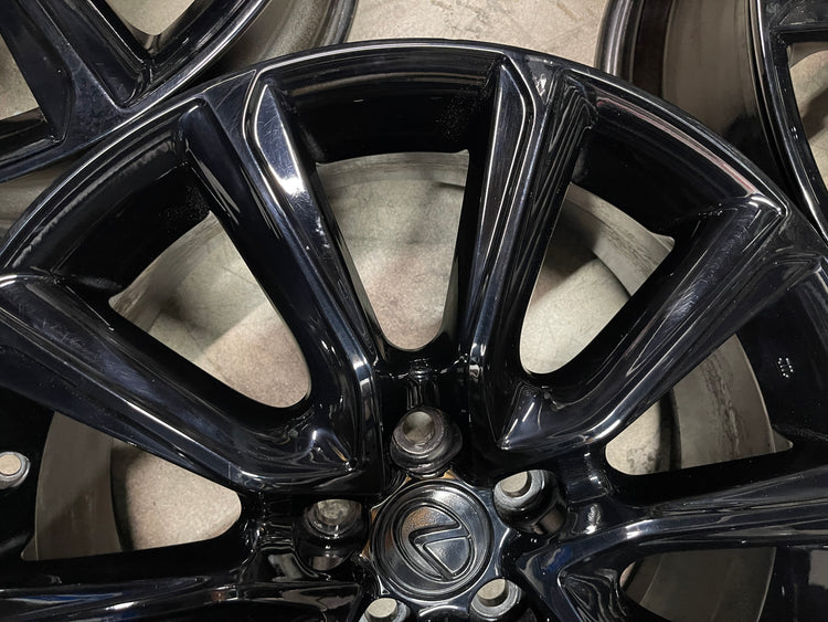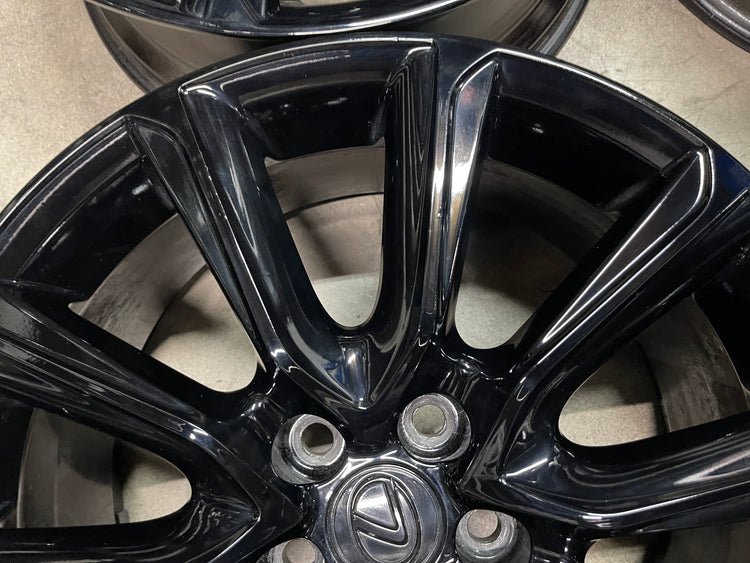 This is a Gently Used set of factory 2019 Lexus RC350 19 inch wheels. The gloss black finish has some scuffs, as shown in pictures. Caps included. No sensors. No lug nuts