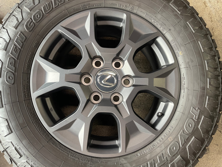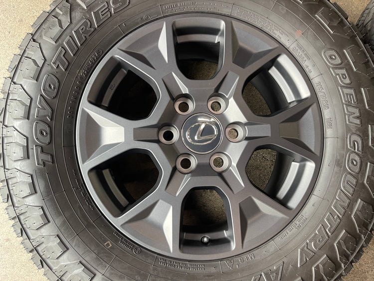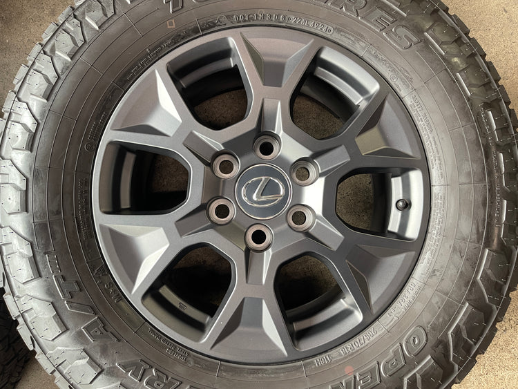 This is a gently used set of factory 2024 2025 Lexus GX550 18 inch wheels and tires. Two wheels have a tiny scuff, as shown pictures. The Toyo Open Country A/T3 265/70HR18 have 90% tread remaining and a 4924 DOT (9/32nd out of 10/32nd new). Caps included. No sensors. Note: Bolt Pattern 6x5.5