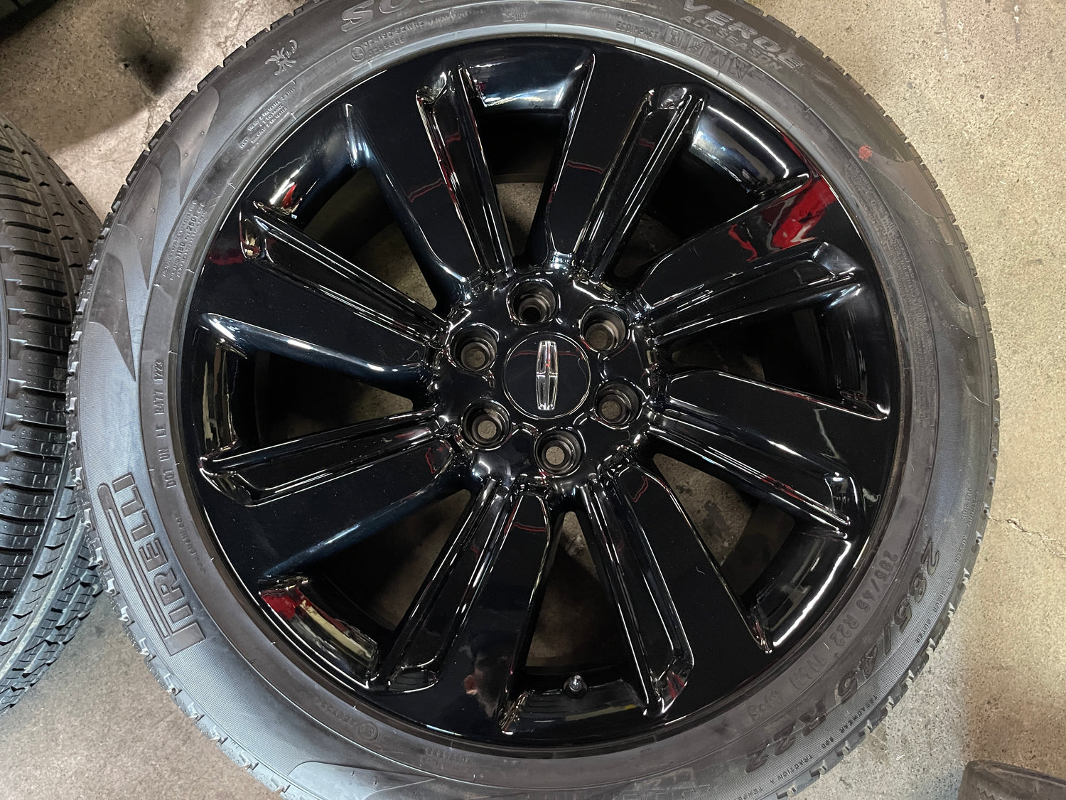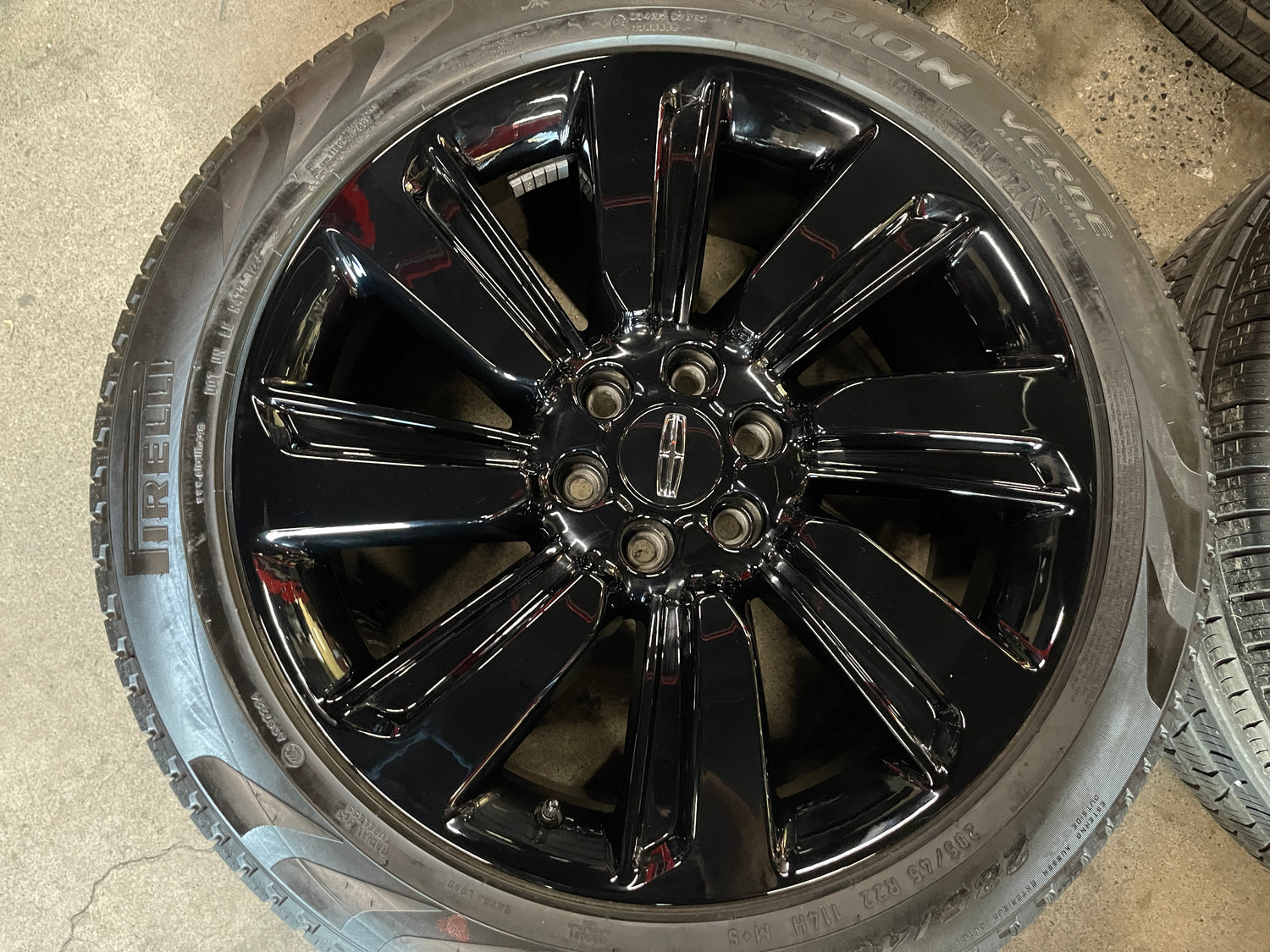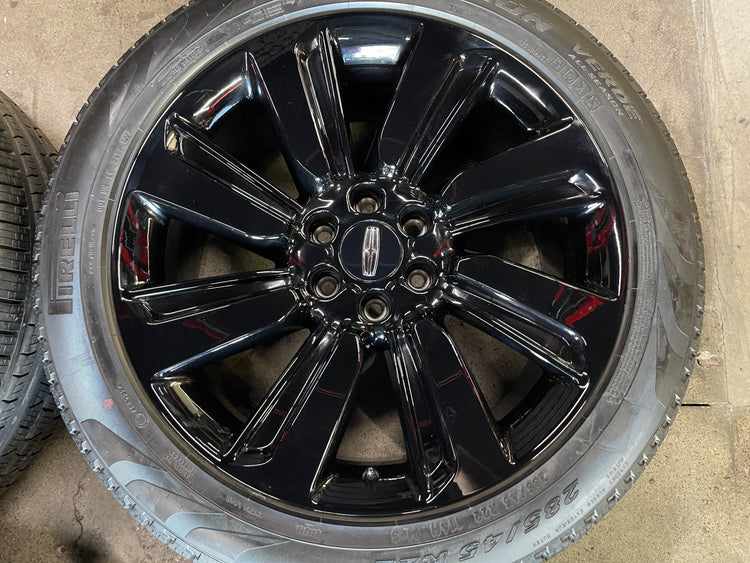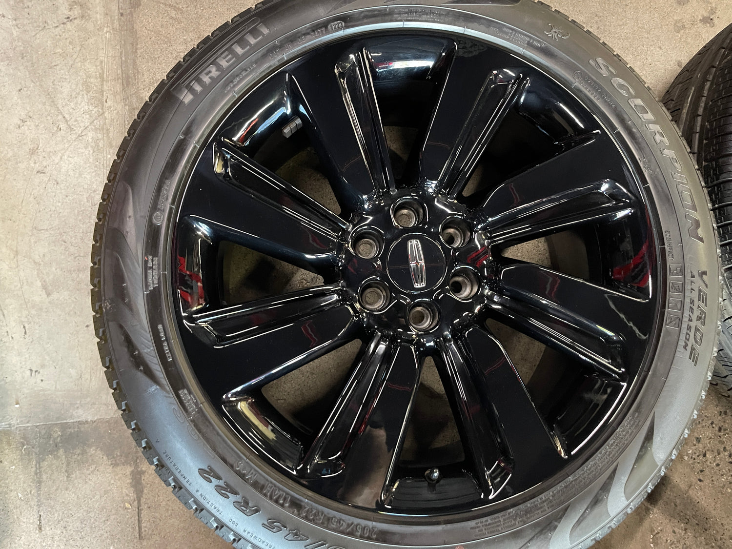 This is a clean take-off set of factory 2024 2025 Lincoln Navigator Black Label 22 inch wheels and tires. The Pirelli Scorpion Verde A/S 285/45RR22 have 99% tread remaining with a 1223 DOT. Caps included, No sensors.  (Note: all used wheels may have light blemishes not visible in pictures when looking up close)