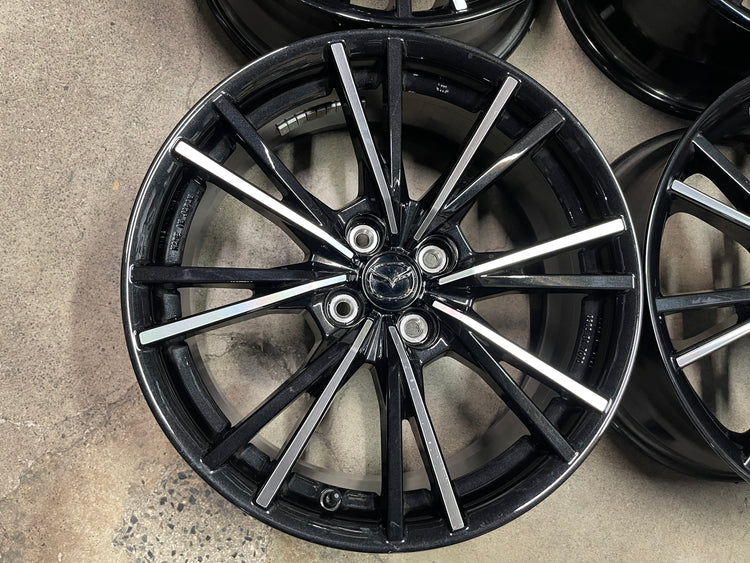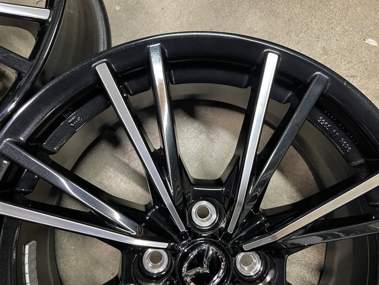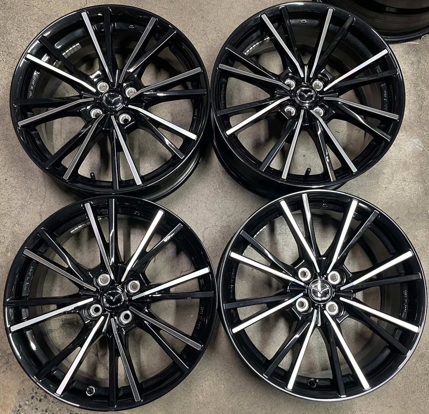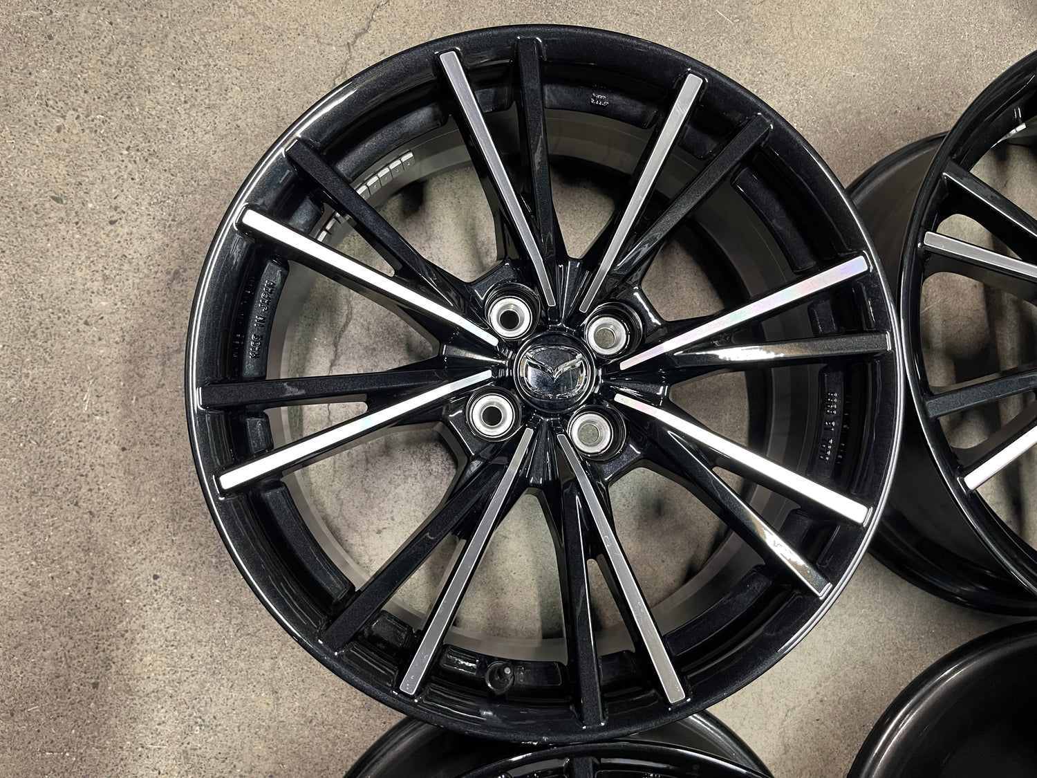 This is a take-off set of factory 2023 2024 2025 Mazda MX-5 Miata 17 inch wheels. One wheel has been touched up on the edge/lip, as shown in pictures (light curb rash , filed and painted). Caps included. No sensors. (Note: light scuffs not visible in pictures are possible when looking up close)