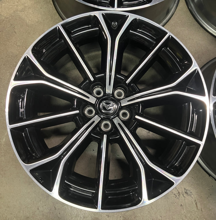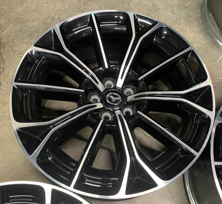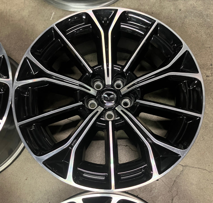 Up for sale is a set of Four 2025 Mazda CX-70 OEM Factory 21" Wheels. The wheels are in takeoff condition with minor blemishes from being handled. Please look at the pictures. These wheels are the machine finish with black inlays. Fits 2025 Mazda CX-70 and CX-90. Guaranteed to be straight and true. Caps included, No sensors. Note": All used wheels may have light blemishes not visible in pictures when looking up close.
