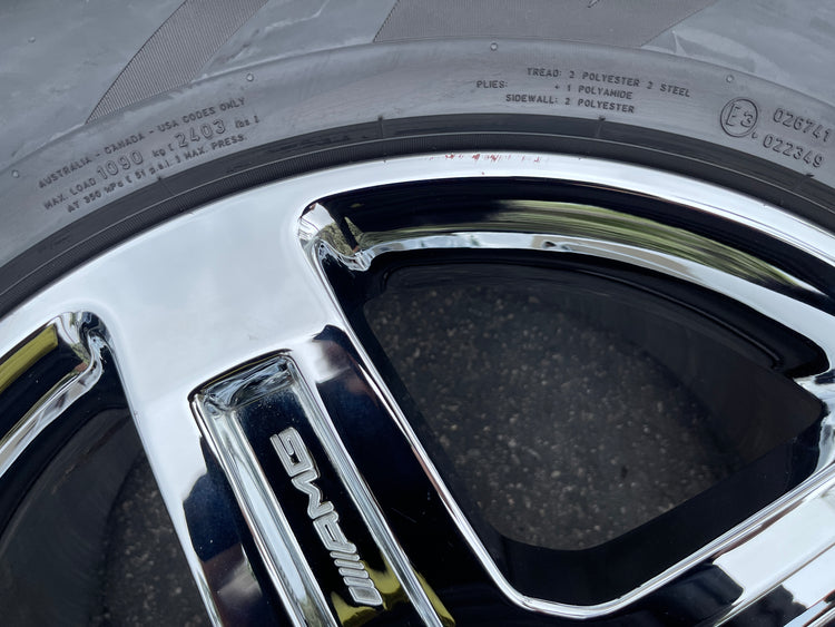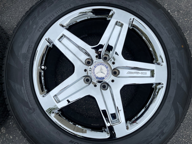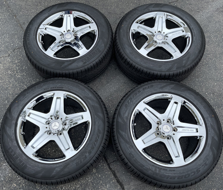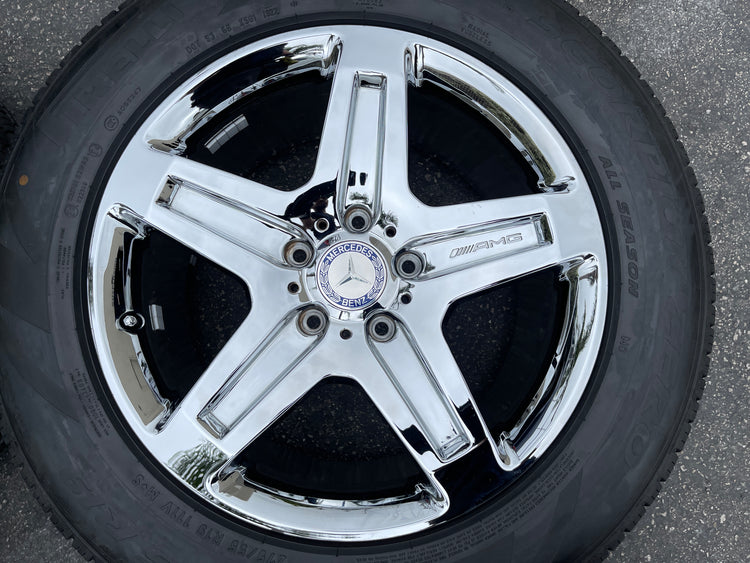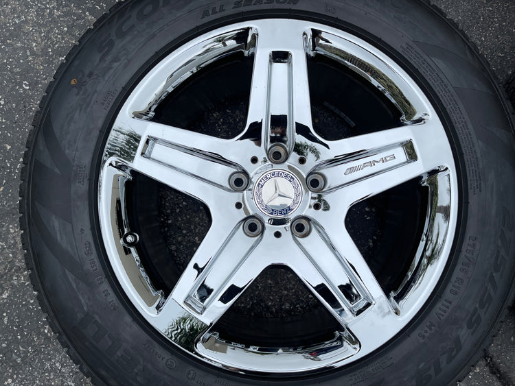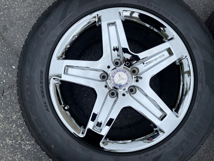This is a set of 2017 MBZ G550 factory 19 inch AMG Wheels and tires (used chrome wheels with take-off tires) The Pirelli Scorpion Zero A/S 275/55VR19 tires have 99% tread remaining. Medallion caps included, NO sensors. (Note: These clear all AMG brakes prior to 2018. We have not tried on 2018 and newer models that come with 20 inch wheels.)