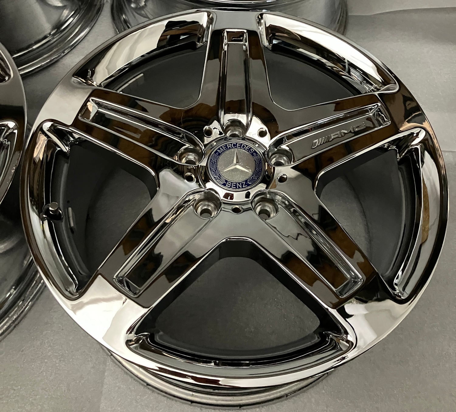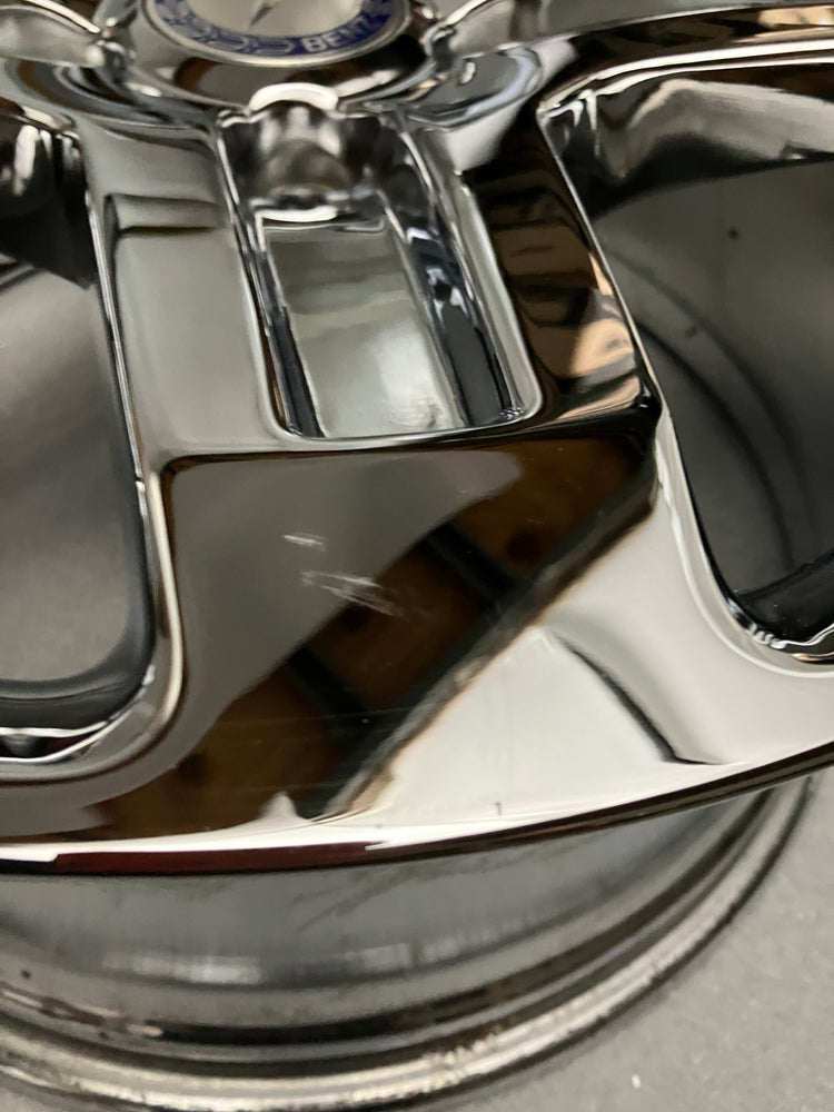 This is a take Off set of 2017 MBZ G550 factory 19 inch AMG Wheels. Used chrome finish, no finish warranty, sold as is. Medallion caps included, NO sensors. (Note: These clear all AMG brakes prior to 2018. No fitment guarantee on 2019 and newer models)