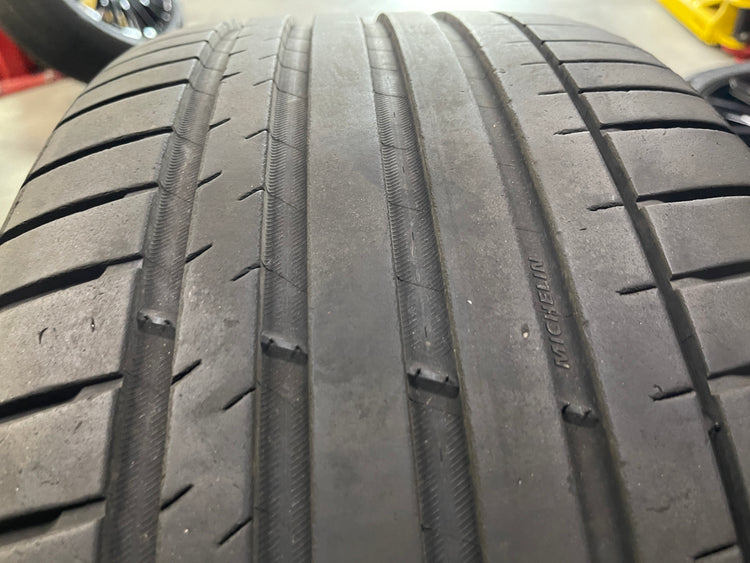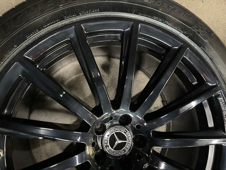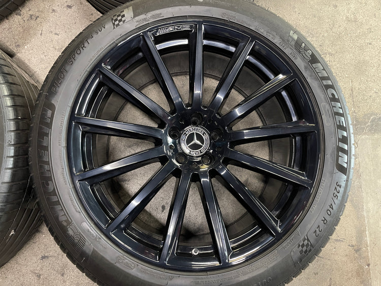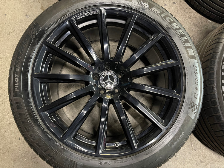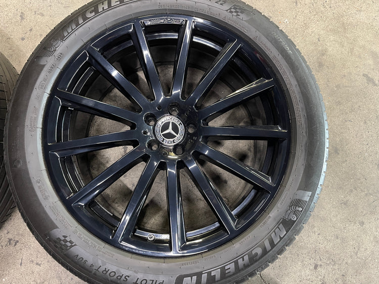 This is set of factory 2023 Mercedes-Benz MBZ GLS450 GLS580 GLS63 22 inch AMG wheels and tires. Light touch ups on a couple of wheels, as shown in pictures. The Michelin Pilot Sport 4 SUV 285/45YR22 & 325/40YR22 have 74% & 63% tread remaining with 4422 and 3321 DOT's. Caps included. no sensors.