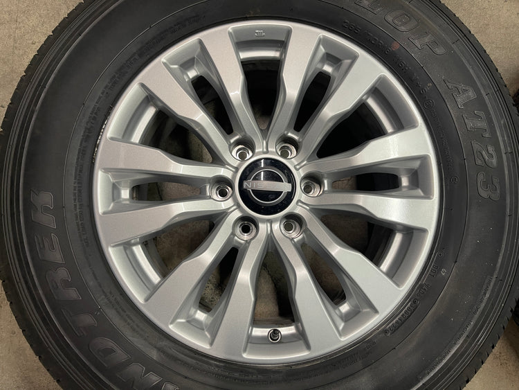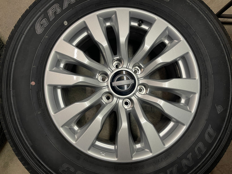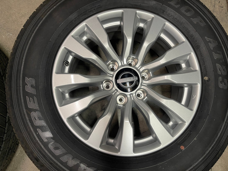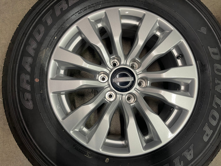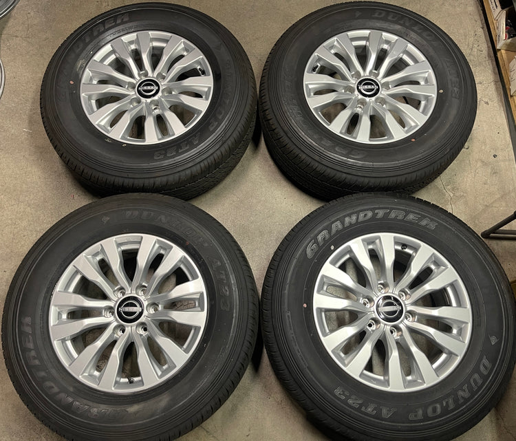 This is a take-off set of 2023 2024 Nissan Armada Titan factory 18 inch wheels and tires. Wheels have been partially reconditioned (cosmetic touch up only). The Dunlop Grandtrek AT23 265/70HR18 have 99% tread remaining with a DOT 4622. Caps included. No sensors.