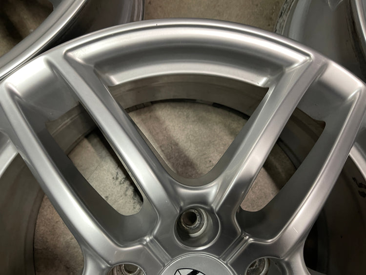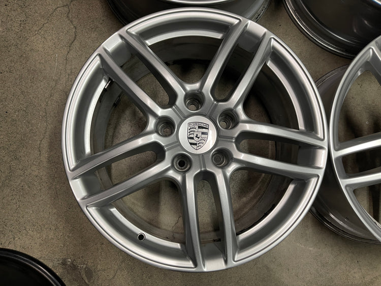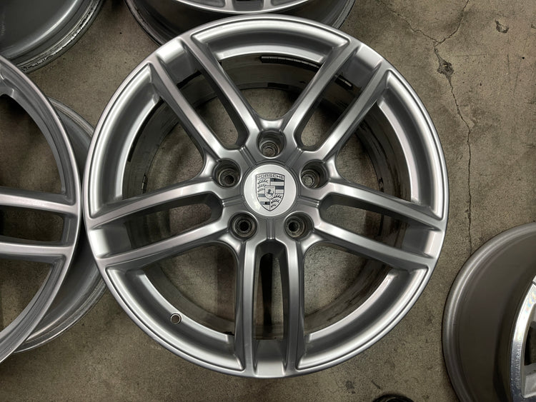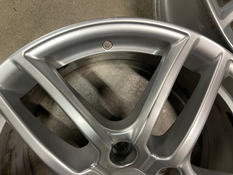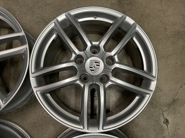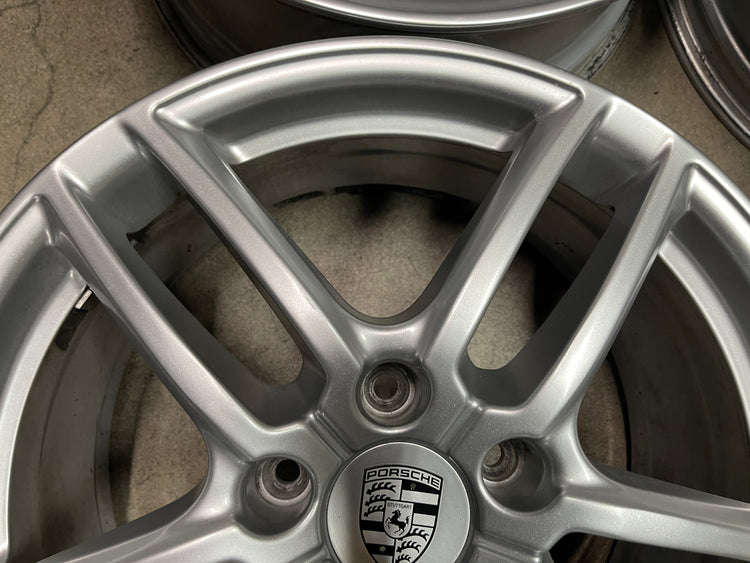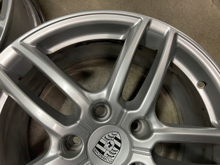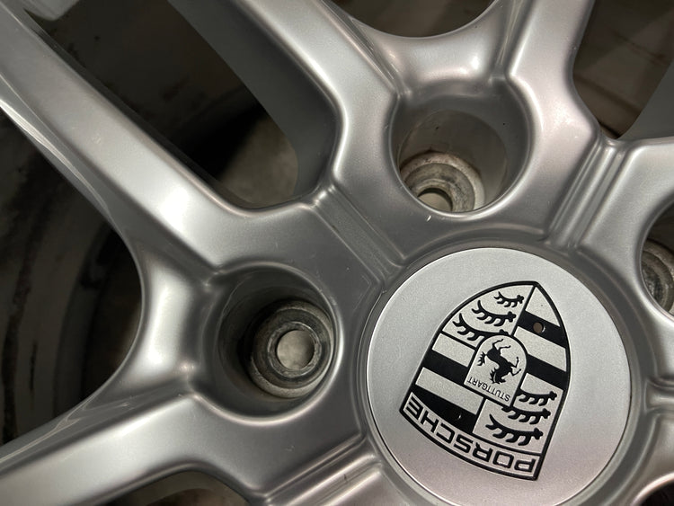 This is a used set of factory 2015 Porsche Cayenne Turbo 19-inch wheels. Light scuffs, see pictures. One wheel has been touched up, as shown in the pictures. Caps included, no sensors.