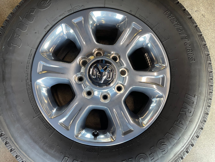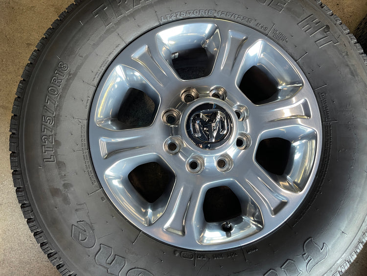 This is a gently used set of factory 2019 2020 2021 2022 2023 2024 Dodge RAM 2500 18 inch wheels and tires. The Firestone Transforce HT LT275/70SR18 have 93% & 80% tread remaining with a 3423 DOT (14/32nd & 12/32nd out of 15/32nd new) Caps included. No sensors. Note: All used wheels may have light blemishes not visible in pictures, when seen up close.