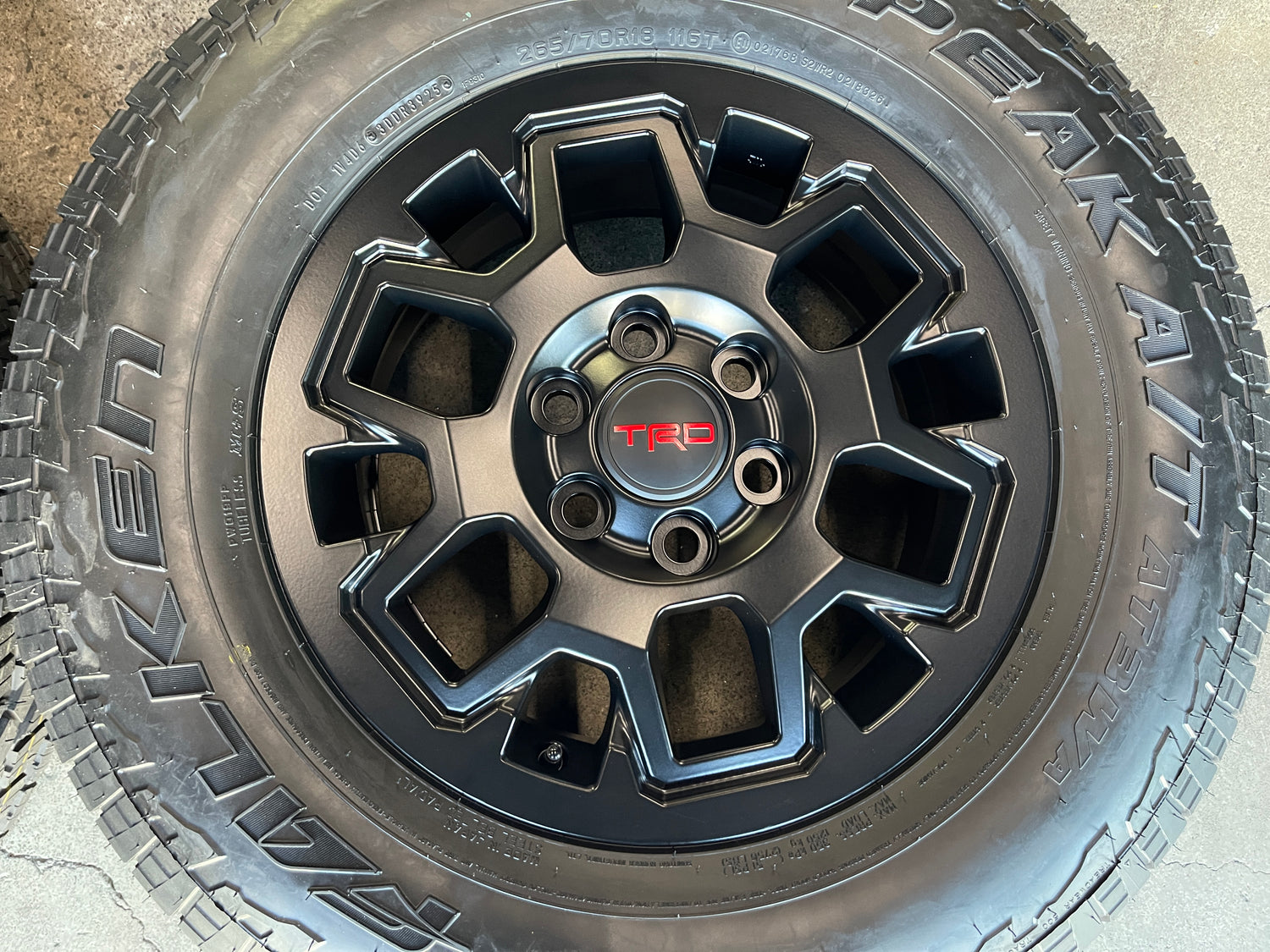 This is a clean set of take off, factory, OEM 2025 2026 Toyota Tacoma TRD 18" wheels and tires. Refinished with a semi gloss black powder coat finish. They are in excellent condition, The tires are Falken WildPeak AT3WA 265/70R18 with 99% tread left and a 3925 DOT. Caps included, Lugs included. No sensors. (All used wheels can show some light scuffs not visible in pictures when looking up close)