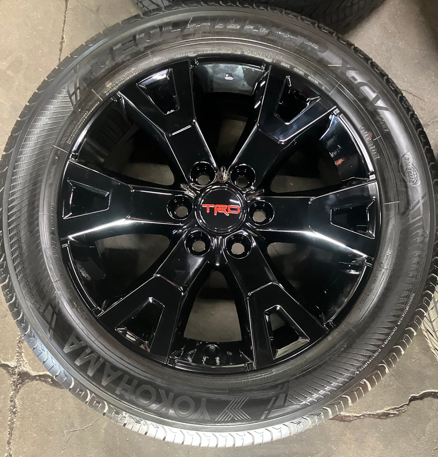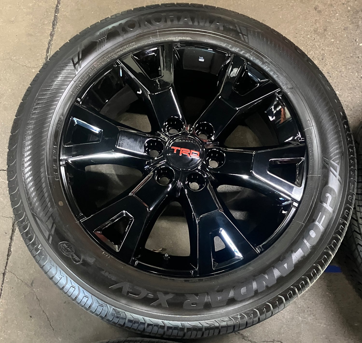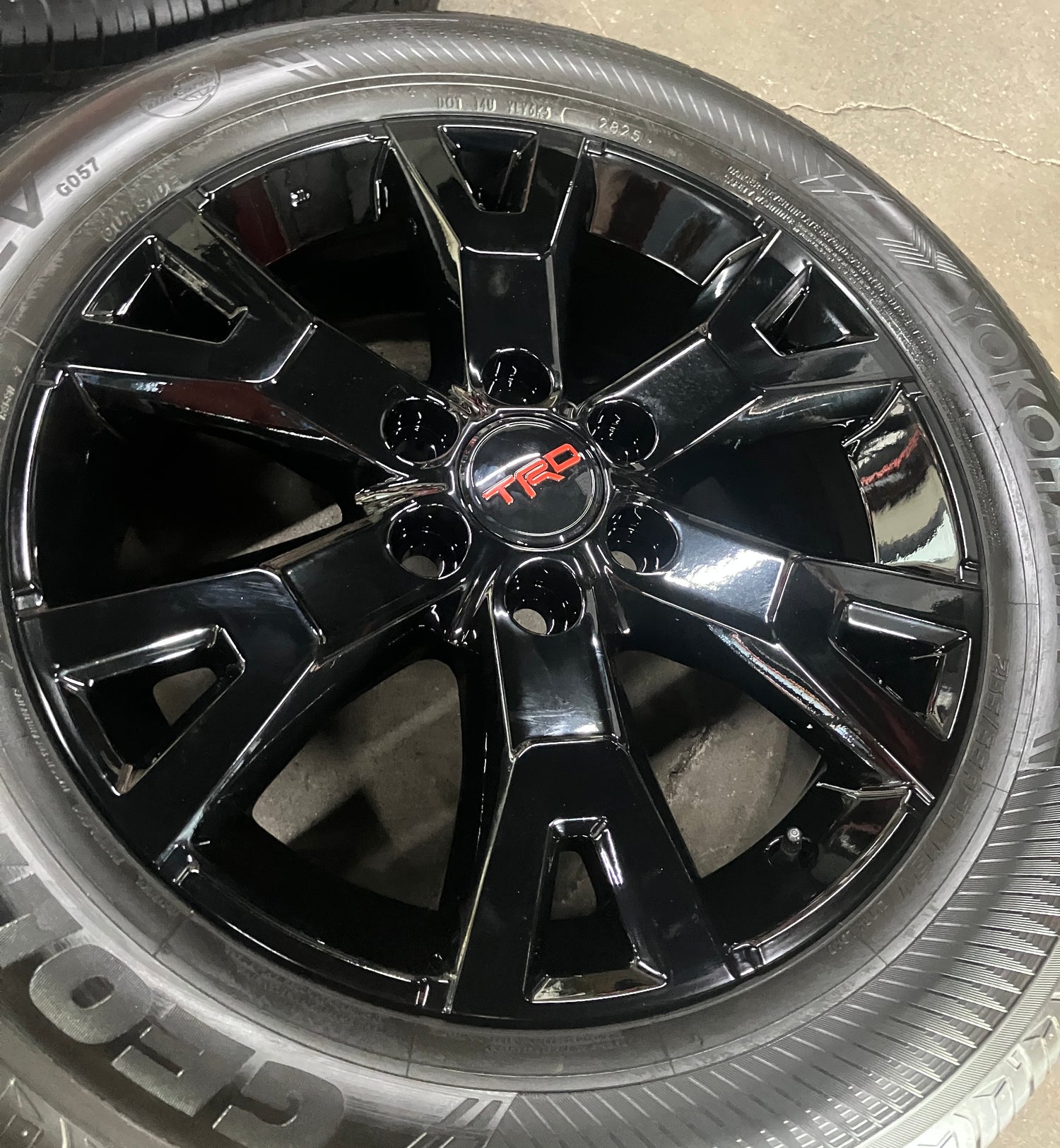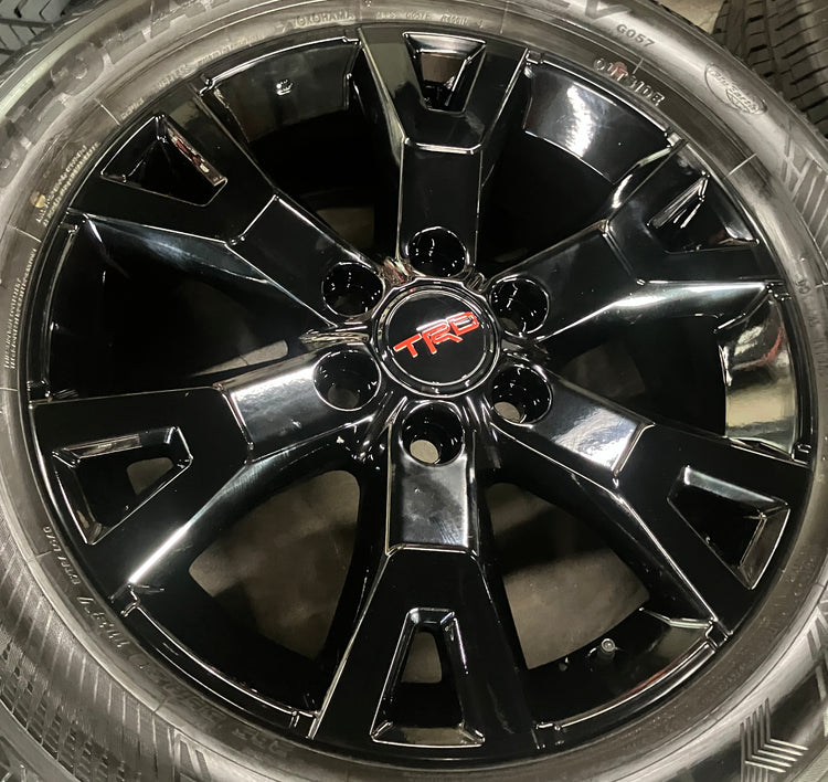 This is a set of factory 2024 2025 2026 Toyota 4Runner TRD Sport 20 inch wheels and tires. Refinished in gloss black powder coating. The gently used Yokohama Geolander X-CV GO57 265/55VR20 tires have 90% tread remaining (9/32nd out of 10/32nd new)(DOT 2825). Caps included. No sensors. Fits your 2024 2025 Tacoma. (All used wheels can show some light scuffs not visible in pictures when looking up close)
