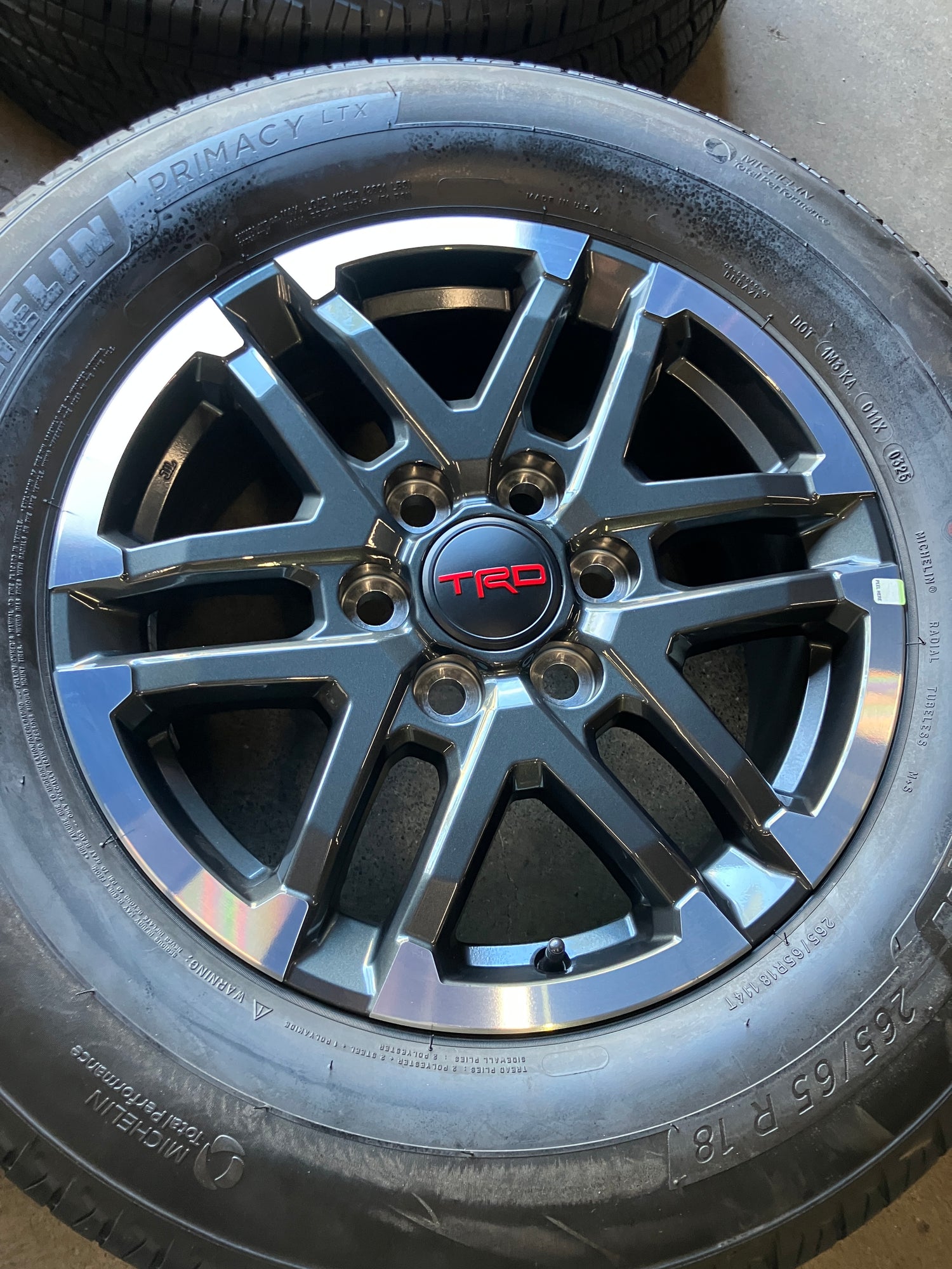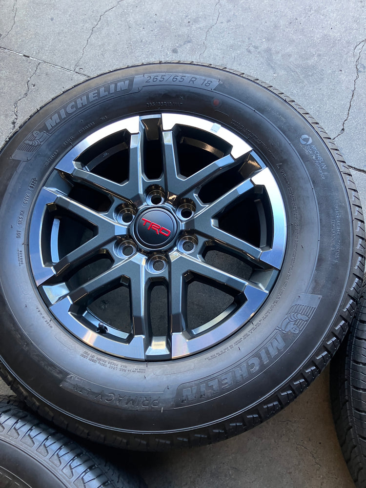 This is a clean Take-off set of factory 2024 2025 2026 Toyota Tacoma TRD 18 inch wheels and tires. The Michelin Primacy LTX 265/65TR18 have 99% tread remaining. Caps included. Lugs included. No sensors.   Does NOT fit prior years (higher offset, smaller center bore) (All used wheels can show some light scuffs not visible in pictures when looking up close)