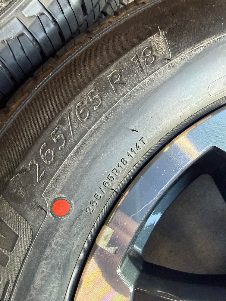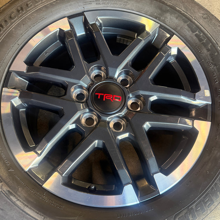 This is a clean Take-off set of factory 2024 2025 2026 Toyota Tacoma TRD 18 inch wheels and tires. The Michelin Primacy LTX 265/65TR18 have 99% tread remaining. Caps included. Lugs included. No sensors. Does NOT fit prior years (higher offset, smaller center bore) (All used wheels can show some light scuffs not visible in pictures when looking up close)