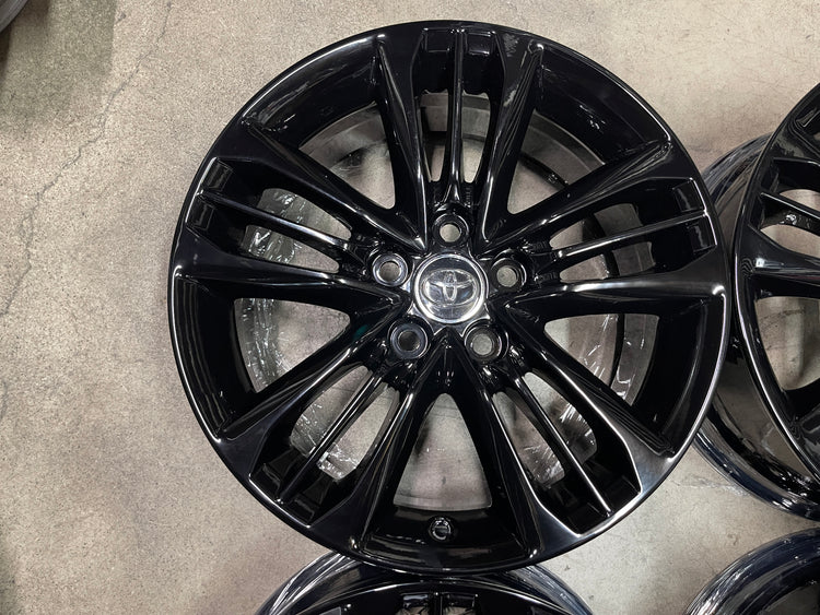 This is a set of factory 2017 2018 2019 2020 2021 2022 2023 2024 Toyota Camry 17 inch wheels. Refinished with a gloss black powder coat finish. Caps included. No sensors.