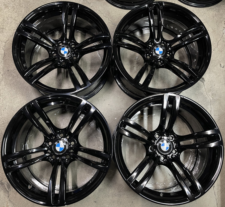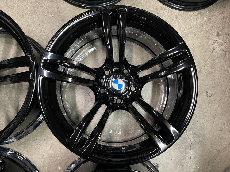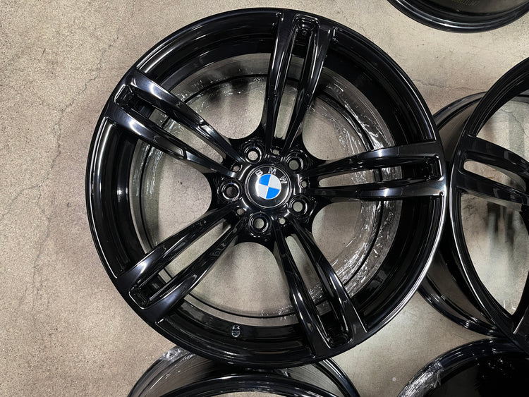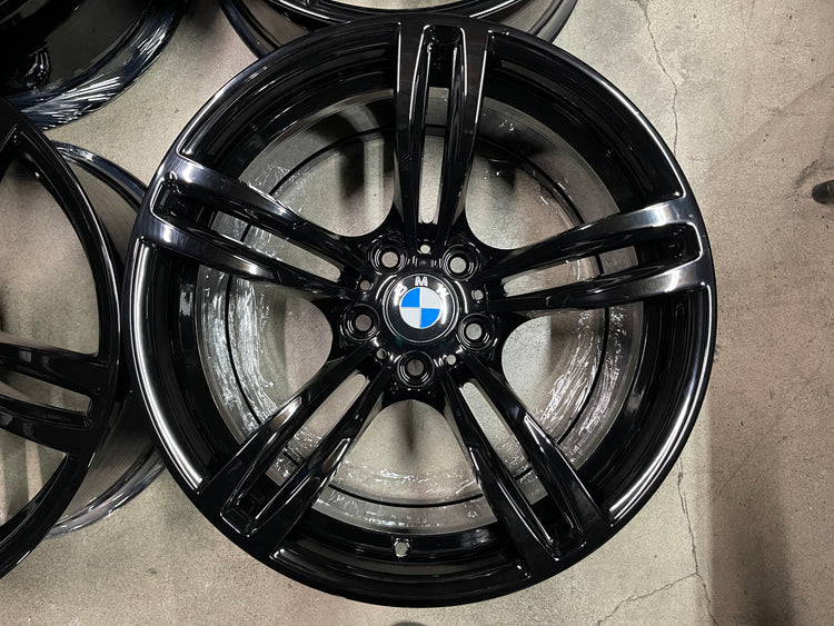 This is a staggered set of factory 2016 2017 2018 2019 2020 BMW M4 19 inch wheels. Refinished with a gloss black powder coat finish. 5x112 bolt pattern. Caps included, No sensors. 19x9 19x10