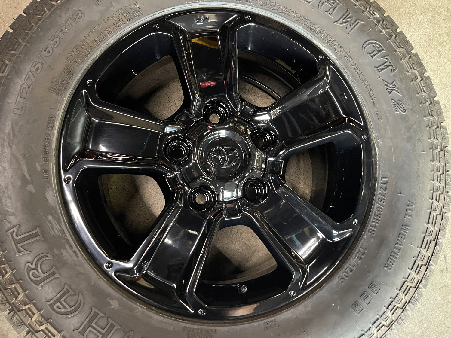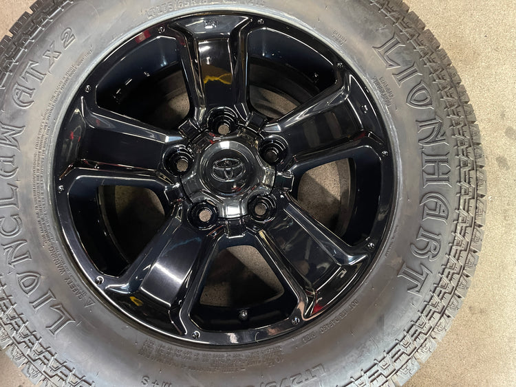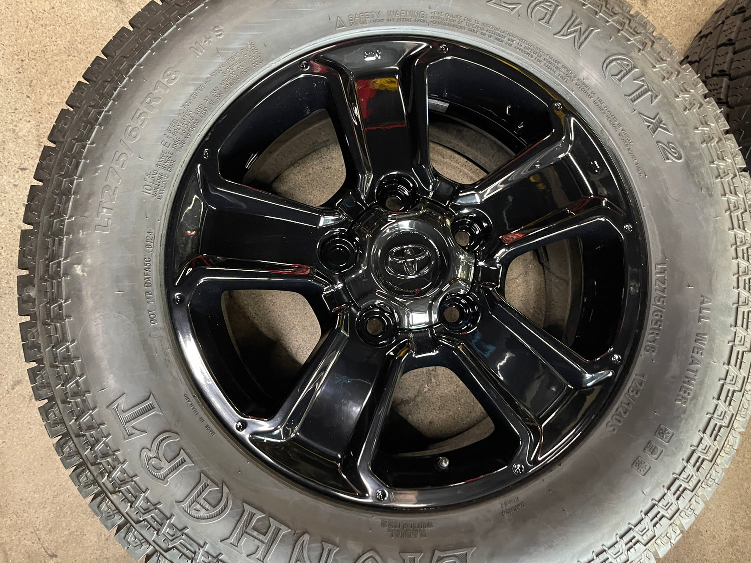 This is a set of refinished factory 2020 Toyota Tundra 18 inch wheels with used tires. Refinished in gloss black powder coating. The Lionhart ATX2 All Weather LT275/65SR18 have 88% & 75% tread remaining (14/32nd & 12/32nd out of 16/32nd new) with a DOT of 0124. Caps included, Lugs included. No sensors. Does NOT fit 2021 and newer (change in bolt pattern (All used wheels can show some light scuffs not visible in pictures when looking up close)
