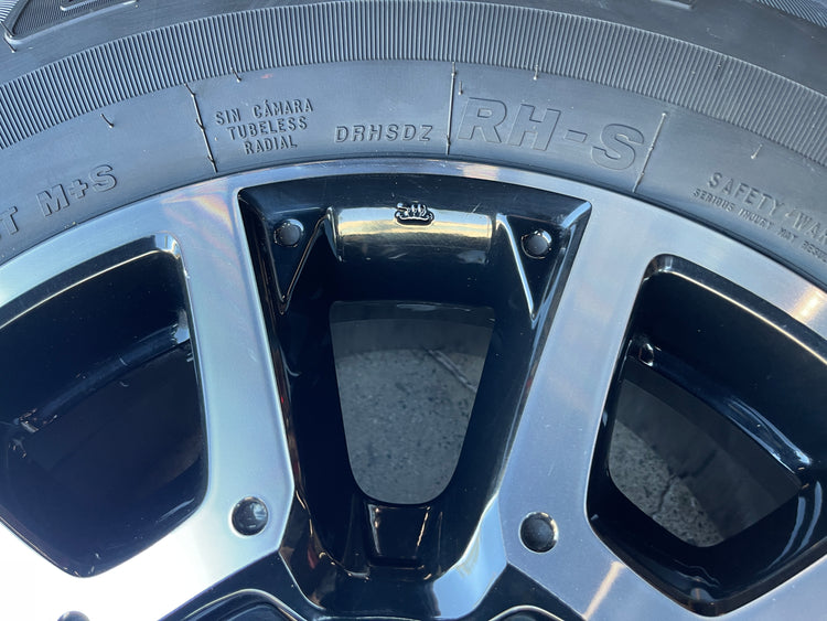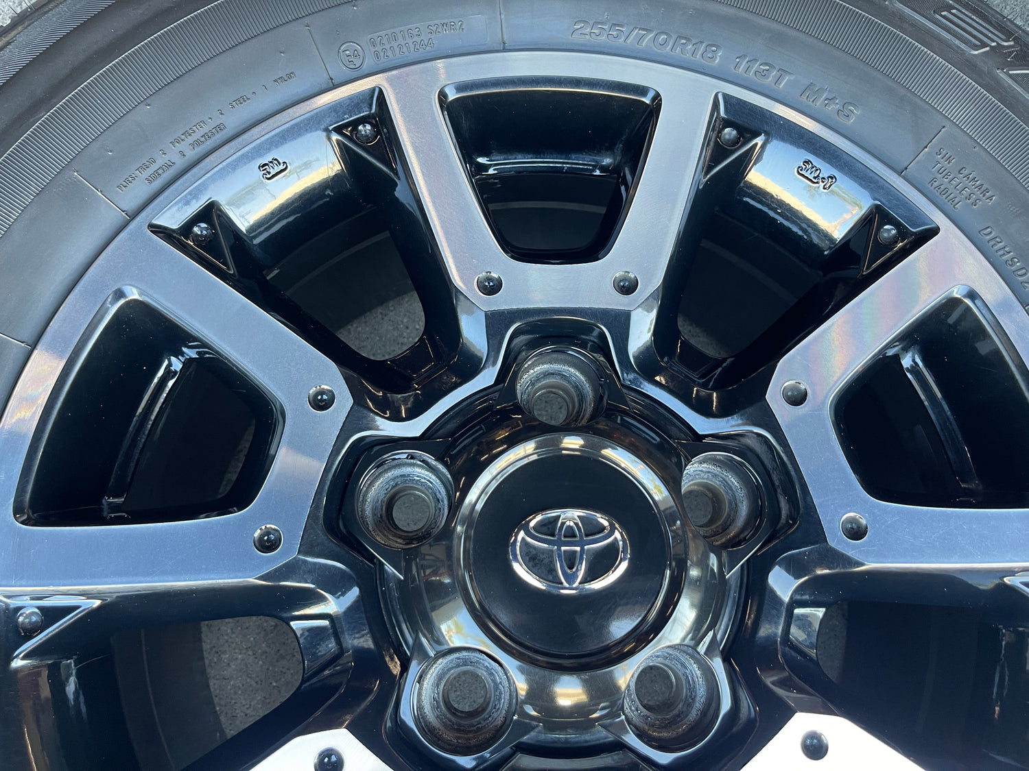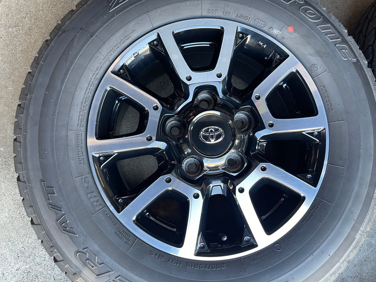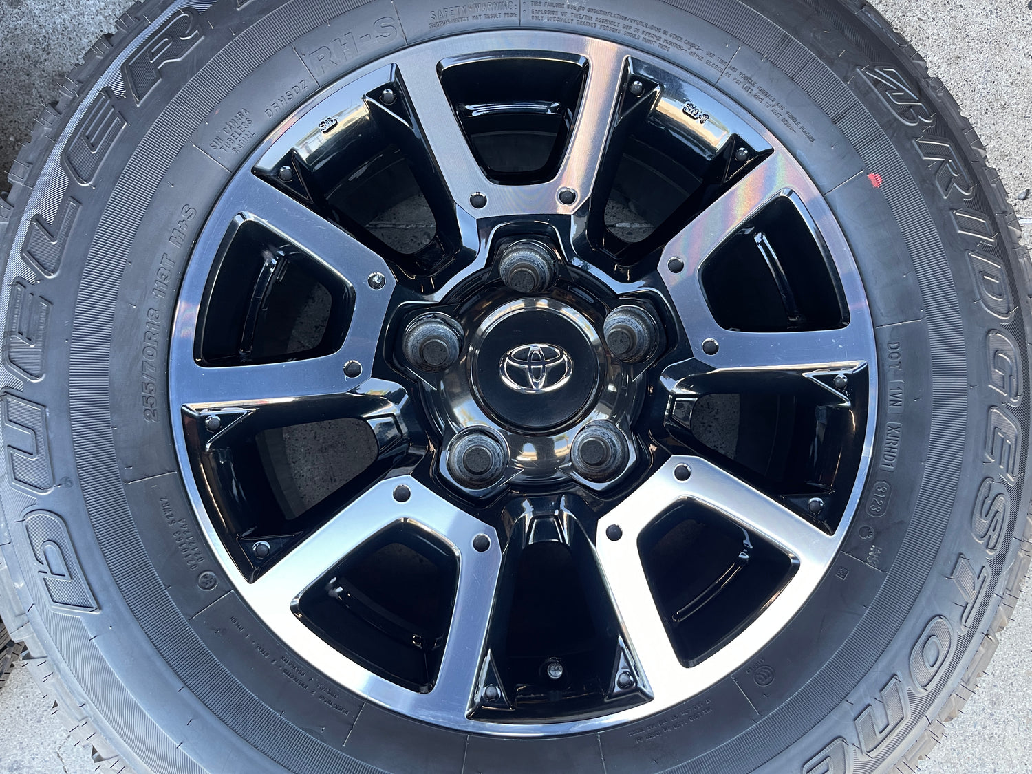 This is a used set of factory 2017 2018 2019 2020 (5x150) Toyota Tundra TRD 18 inch wheels with TAKE-OFF tires. Wheels have a few scuffs, one has filled lips/edges, as shown in the pictures. The Bridgestone Dueler A/T RH-S 255/70TR18 tires have 99% tread remaining with a DOT 3123. Caps included. NO sensors. Lug Nuts required if upgrading from steel wheels - available for an extra $50.00 (not included in listed price). (Note: Used wheels may have light blemishes not visible in pictures when looking up cloase)