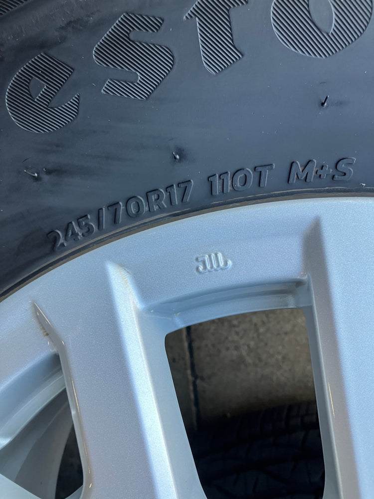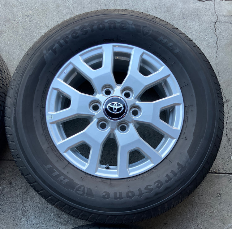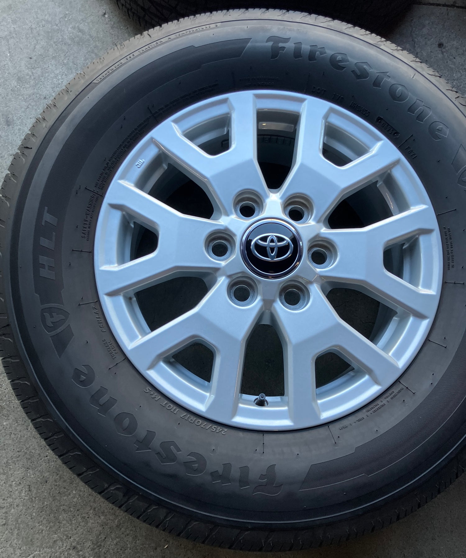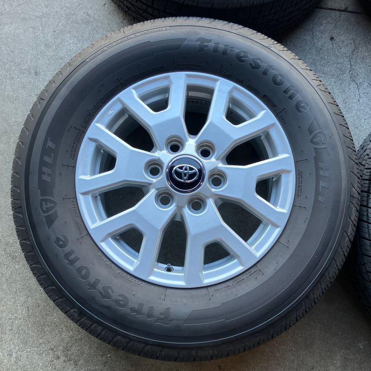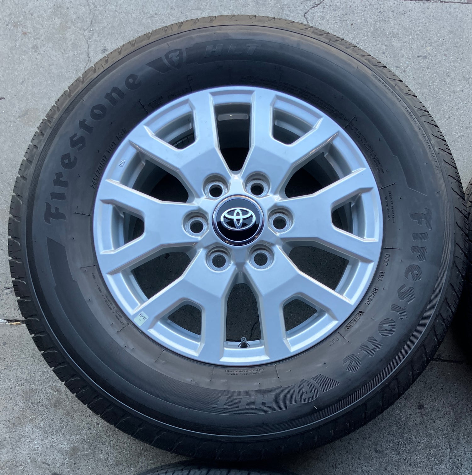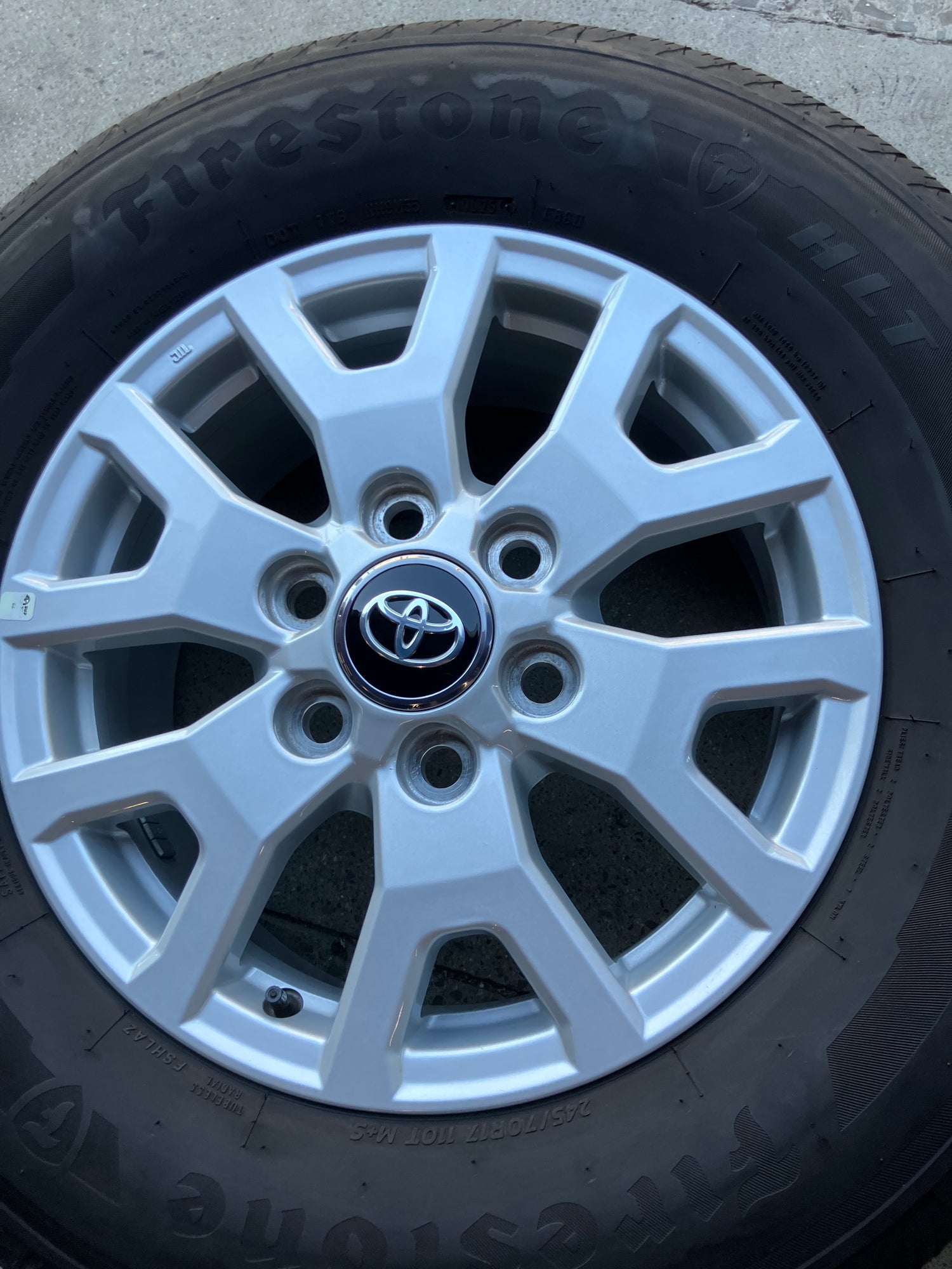 This is a clean, gently used set of factory 2024 / 2025 Toyota Tacoma 17 inch alloy wheels and tires. The Firestone HLT 245/70SR17 tires have 80% tread remaining (8/32nd out 10/32nd new with a 0625 DOT). Caps included. Sensors included and installed. Lug nuts with locking lugs and key included. THESE WILL NOT FIT 2023 AND OLDER TRUCKS. Note: Sensors are free, no warranty, not responsible for reset fees, no cash value, no guarantee they will be compatible with your vehicle.