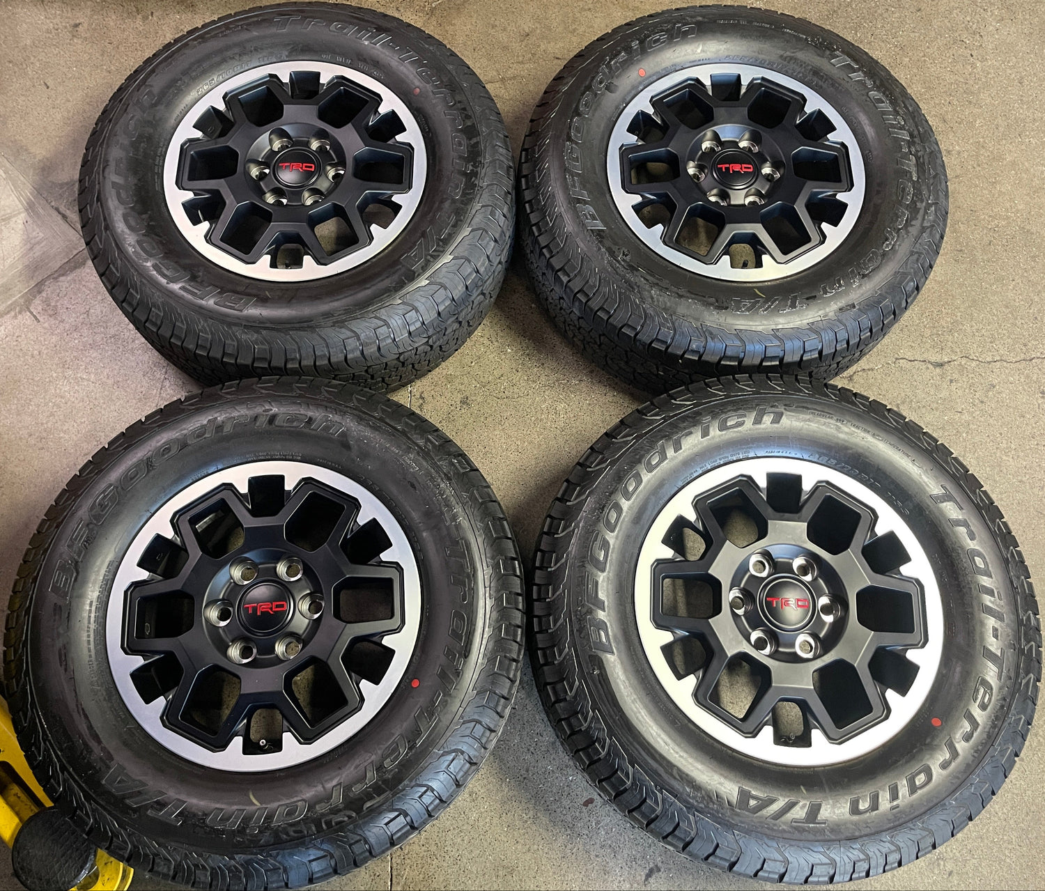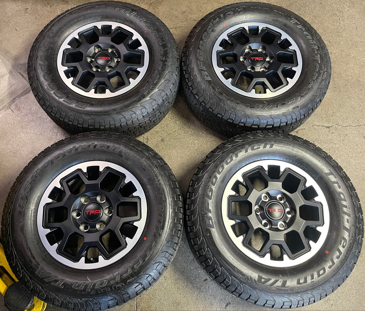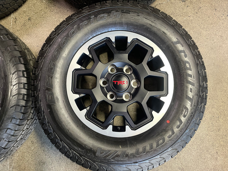This is a clean Take-off set of factory 2026 Toyota Tacoma TRD 17 inch wheels and tires. OEM Matte gray finish with machined lip. The BFGoodrich Trail-Terrain T/A 265/70SR17 have 99% tread remaining with a 0625 DOT. Caps included. No sensors. Lug Nuts included. Only fits 2024 2025 2026 models, Does NOT fit prior years (higher offset, smaller center bore)