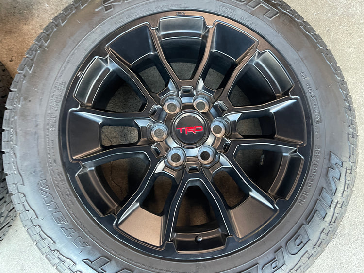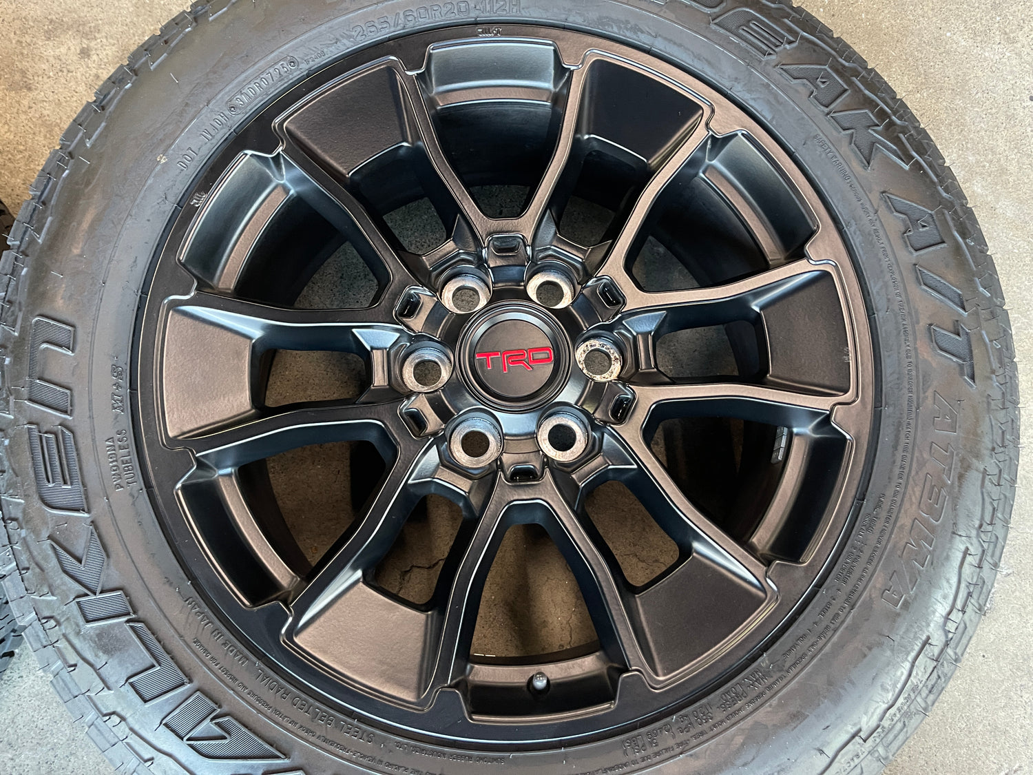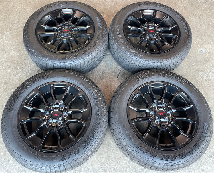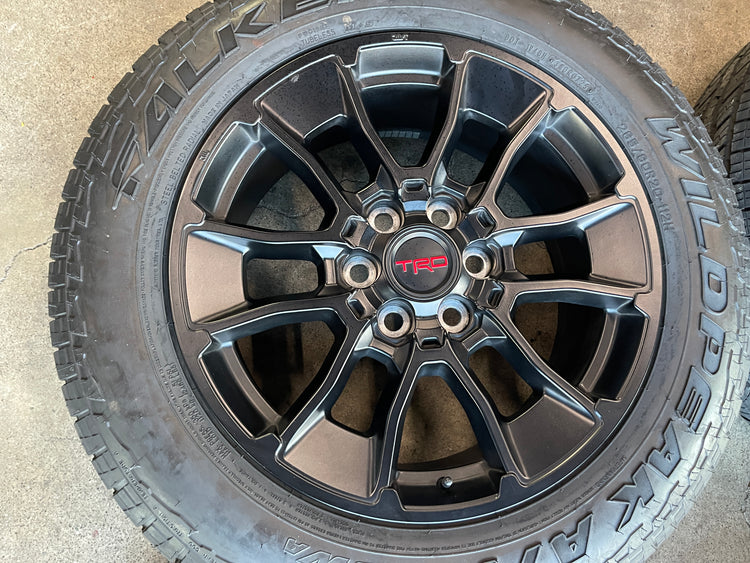 This is a Gently used set of factory 2025 Toyota Tundra TRD Adventure 20 inch Black Forged wheels and tires. The Falken Wildpeak AT3WA 265/60HR20 tires have 95% & 84% tread remaining.(9/32nd & 8/32nd out of 9.5/32nd new, DOT 0725) Caps included. No sensors. (All used wheels can show some light scuffs not visible in pictures when looking up close)
