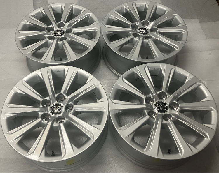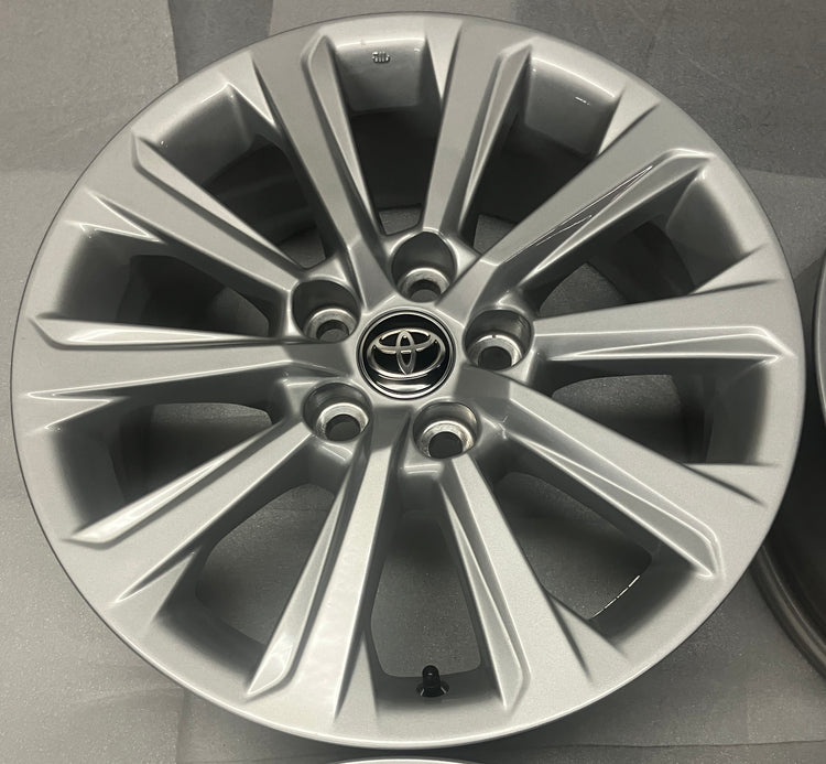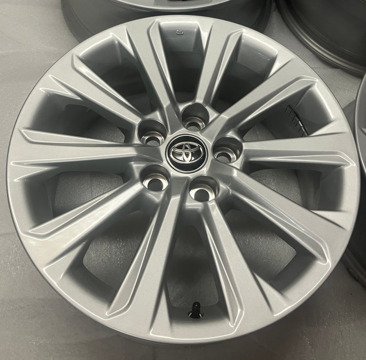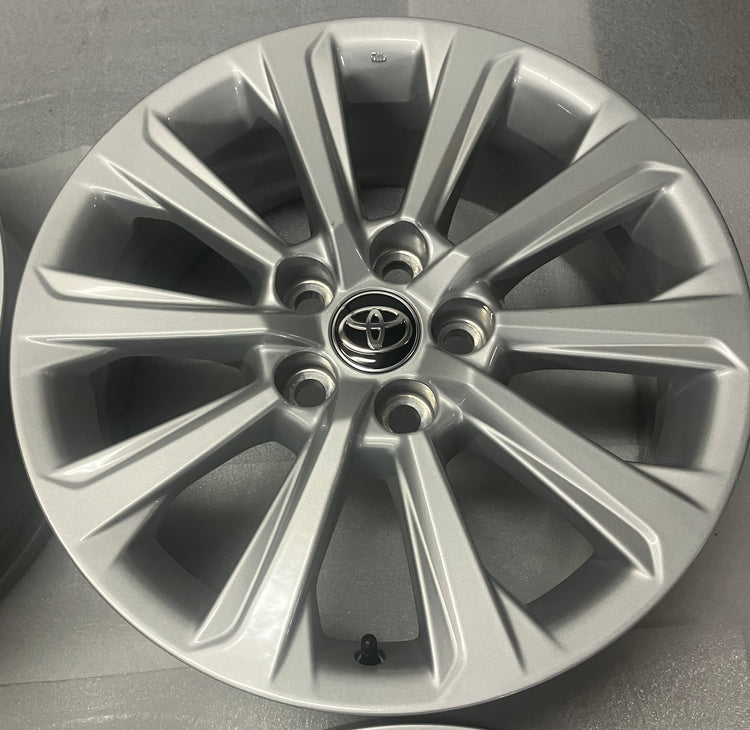 This is a clean 2024 2025 Factory Take Off set of Toyota Grand Highlander 18 inch wheels. Caps included, No sensors. Note: The Grand Highlander is a 5x120 bolt pattern , does NOT fit regular highlander models !! All used wheels may show light blemishes not visible in pictures when looking up close.