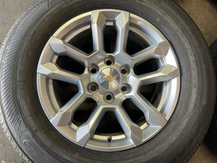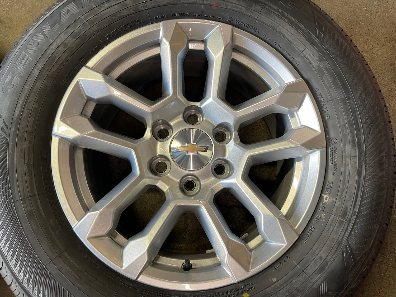 This is a clean Take-off set of 18" 2025 Silverado 1500 Wheels mounted on a take off set of Yokohama Geolander X-CV GO57 265/70R18 . The tires have 99% tread left with 0322 DOT. Fits Chevy and GMC 1500 Trucks and SUV from 2007-2025. Caps included. No Sensors. (Note: These tires are 1 inch taller than stock OEM size)