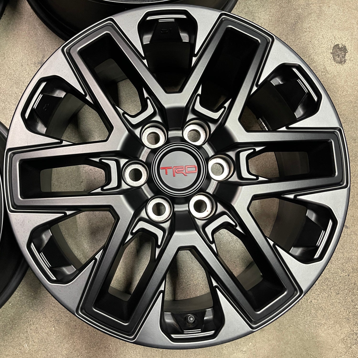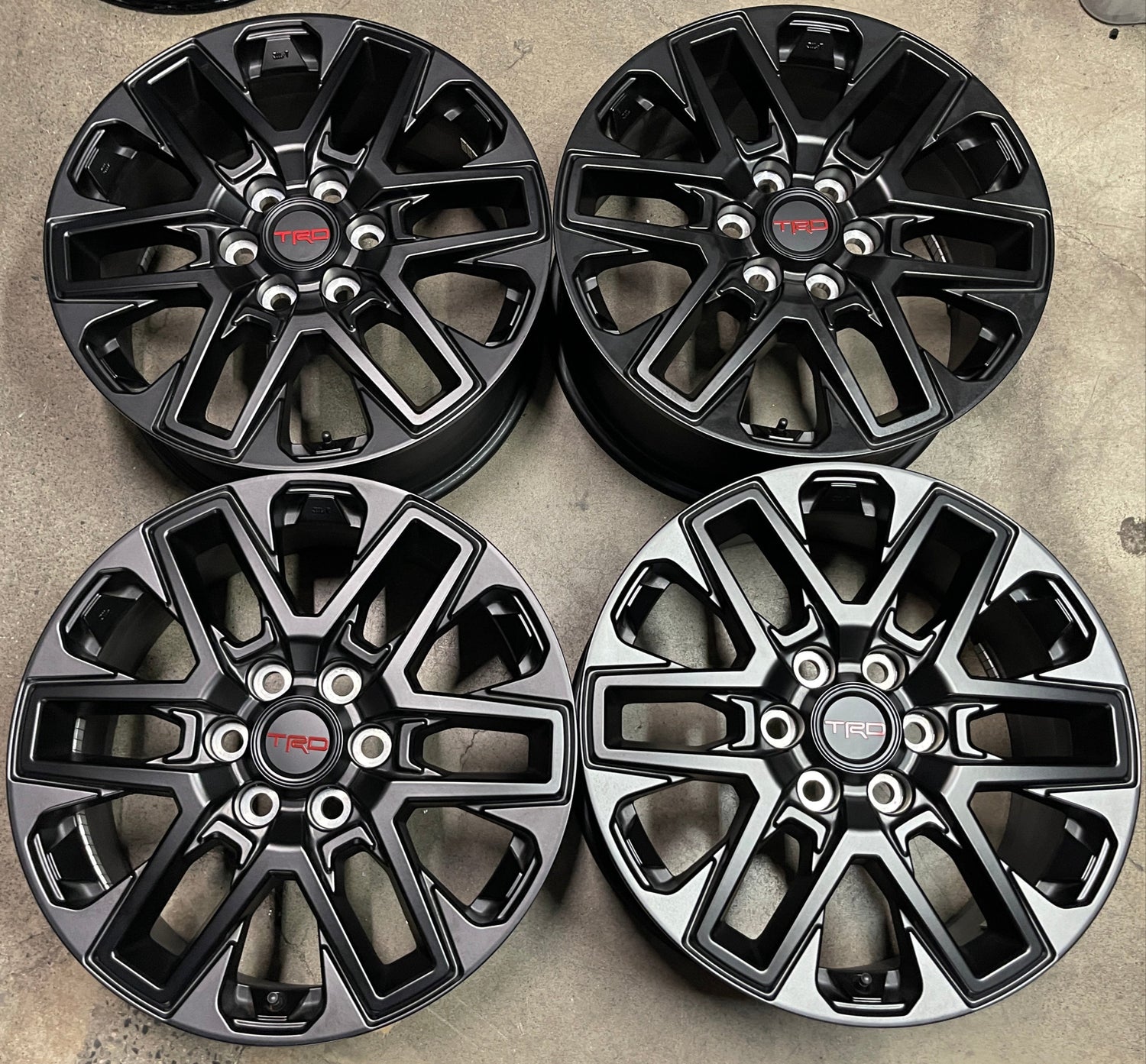 This is a take Off set of factory 2022 2023 2024 2025 Toyota Tundra TRD 20 inch wheels. Minor blemishes from being handled, OEM black finish. TRD Caps included. No sensors. (Note: light scuffs not visible in pictures are possible when looking up close)