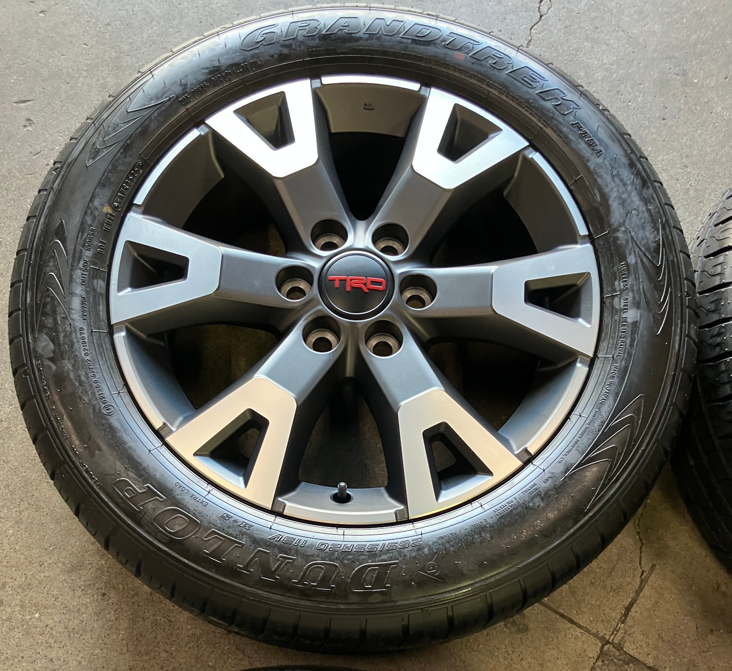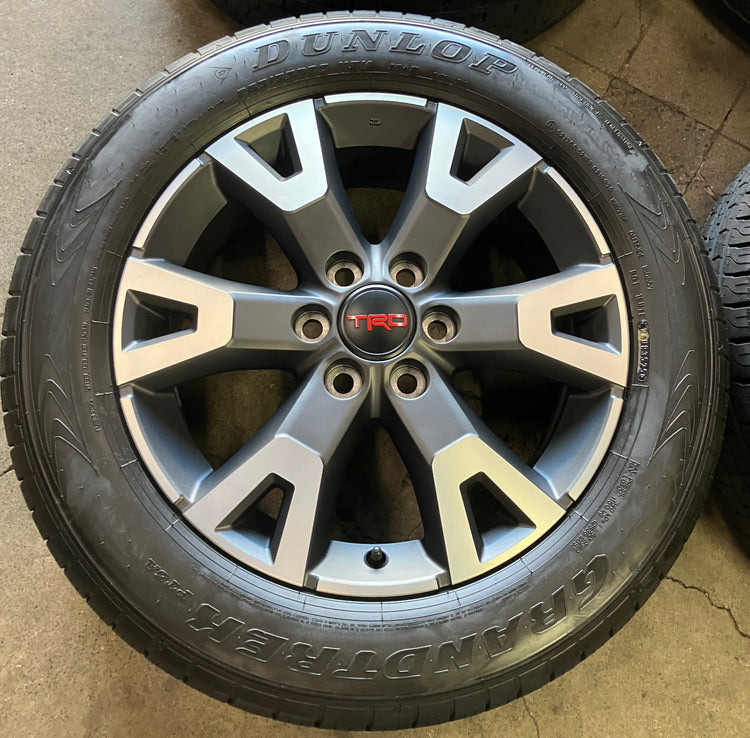 This is a clean Take-off set of factory 2024 2025 2026 Toyota 4Runner TRD Sport 20 inch wheels and tires. These wheels and tires are in excellent condition. The Dunlop Grand Trek PT5A 265/55VR20 tires have 99% tread remaining with a 3525 DOT. Caps included. No sensors. Fits your 2024 2025 2026 Tacoma. (All used wheels can show some light scuffs not visible in pictures when looking up close)