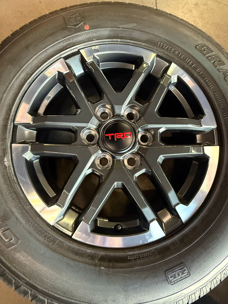 This is a clean Take-off set of factory 2024 2025 2026 Toyota Tacoma TRD 18 inch wheels and tires. The General Grabber HTS 265/65TR18 have 99% tread remaining. Caps included. Lugs included. No sensors. Does NOT fit prior years (higher offset, smaller center bore) (All used wheels can show some light scuffs not visible in pictures when looking up close)