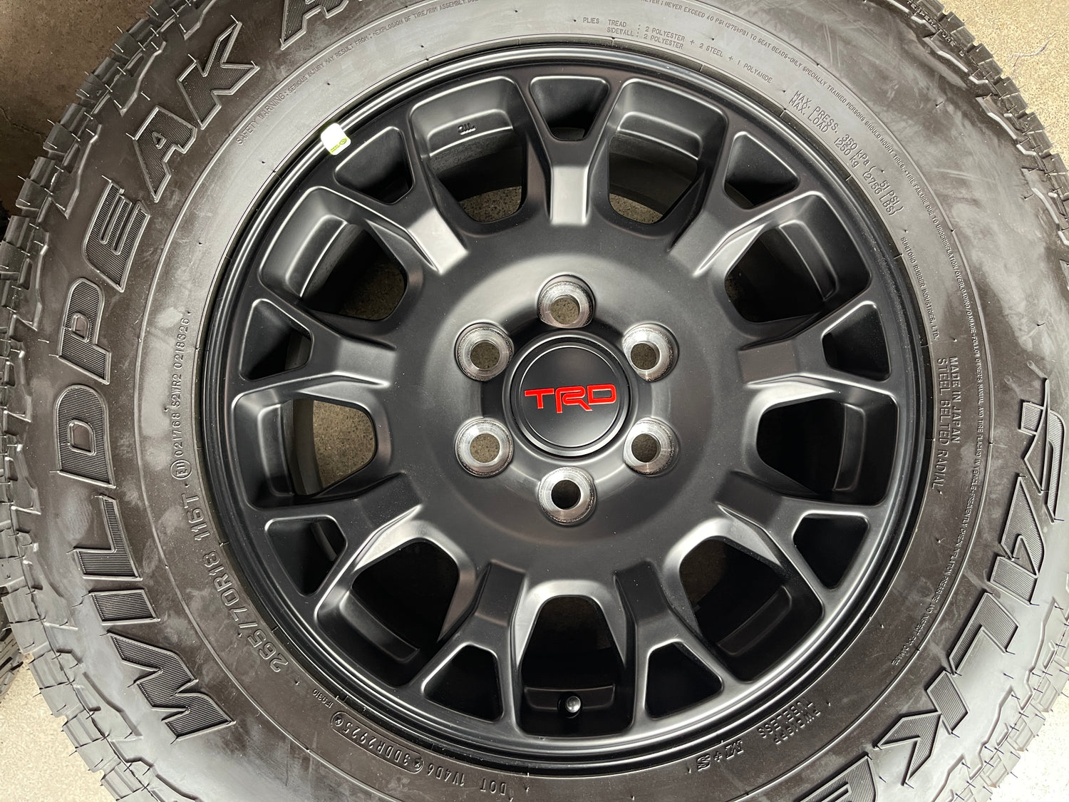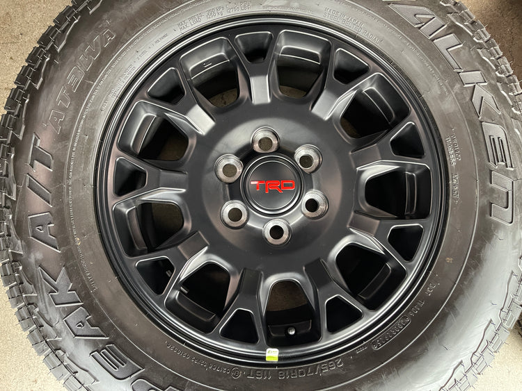 This is a set of four, Authentic, OEM, 2025 2026 Toyota Tacoma TRD 18" wheels and tires. They are in excellent take off condition, factory satin black finish. The tires are 265/70R18 Falken WildPeak AT3WA with 99% tread left and a 2925 DOT. Caps included, No sensors.