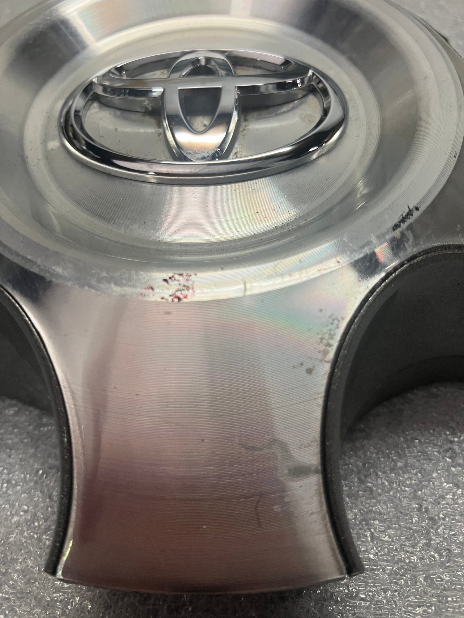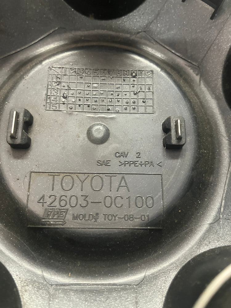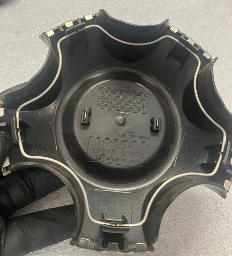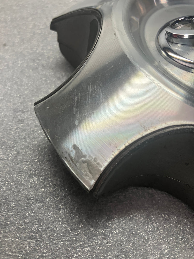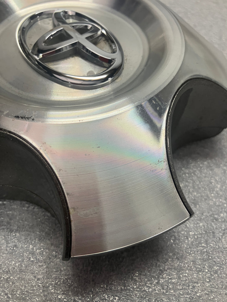 This is an AUTHENTIC, OEM, Toyota Tundra and Sequoia center cap. The cap is machined finish with numerous blemishes, please look at the picture. All the retention clips and ring are intact and in good nick. Toyota part number 426030C100.