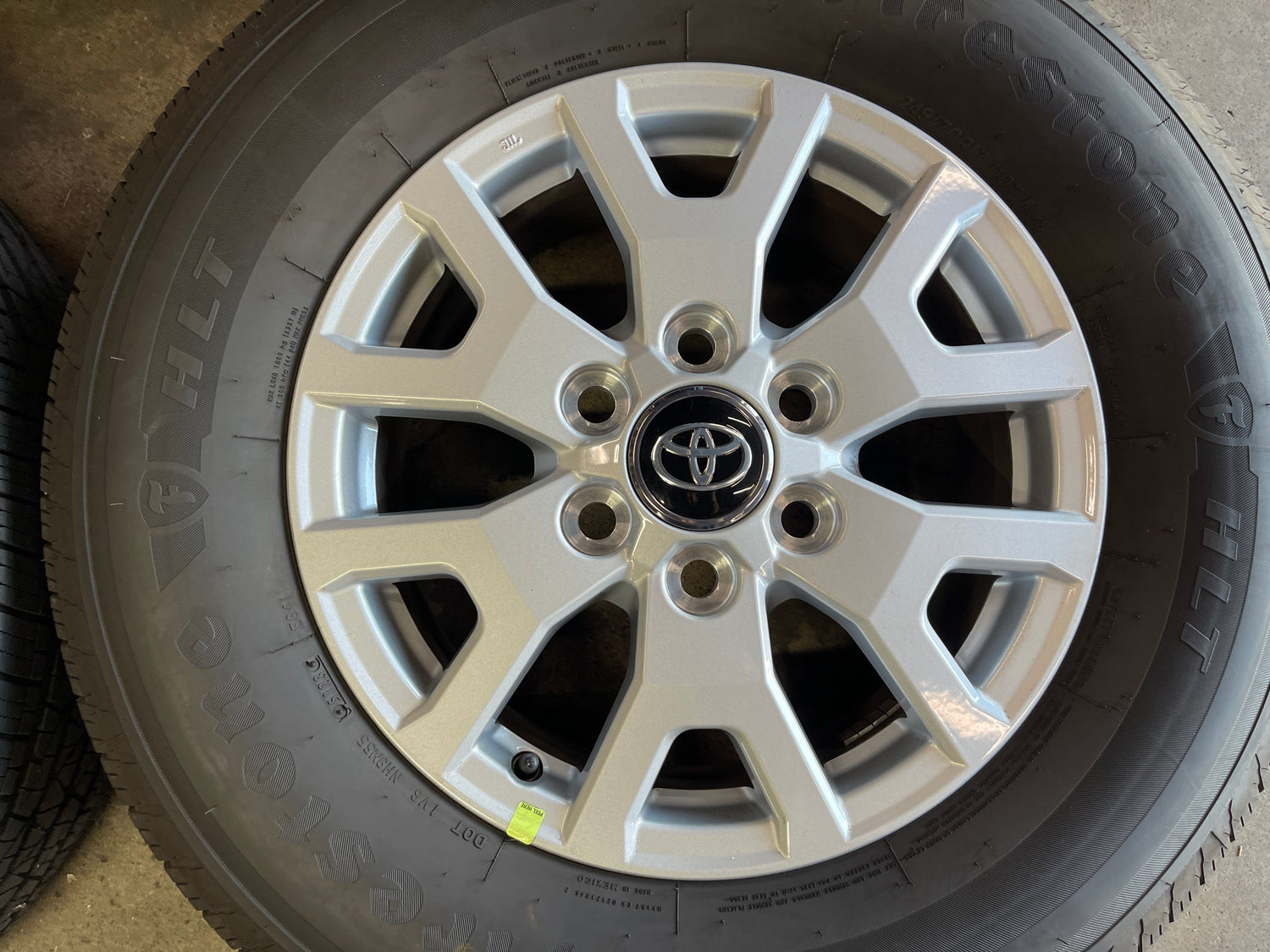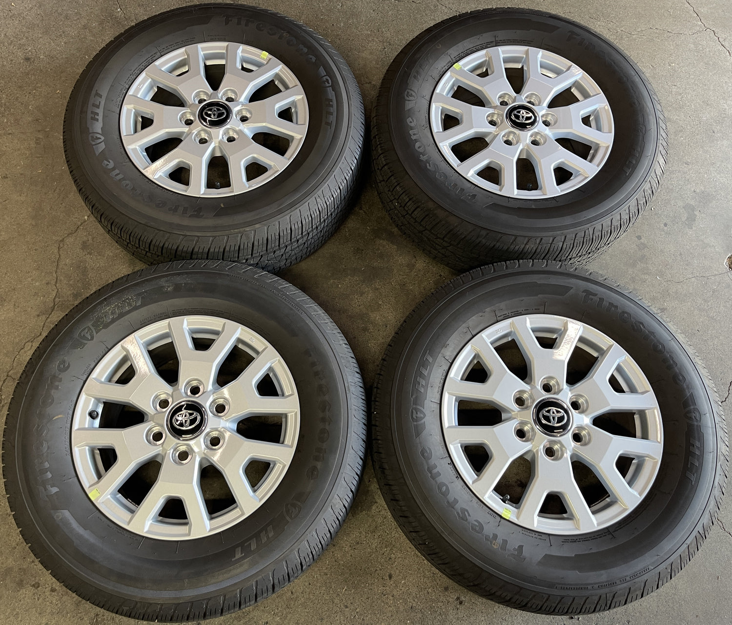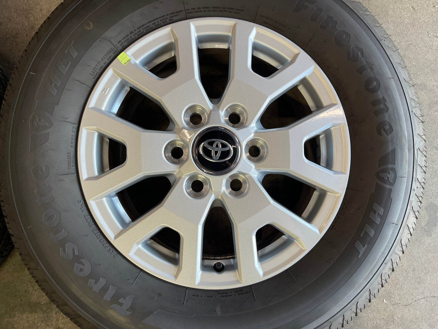 This is a clean, gently used set of factory 2024 Toyota Tacoma 17 inch wheels and tires. The Firestone HLT 245/70SR17  tires have 99% & 90% tread remaining 10/32nd & 9/32nd out 10/32nd new). Caps included. No sensors. Factory lug nuts are required if upgrading from steel wheels (extra $50.00). Does NOT fit prior years !!!