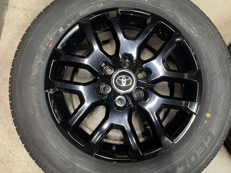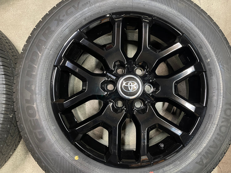 This is a Take-Off set of factory 2024 Toyota Tundra Platinum 20 inch wheels and tires. Refinished with a gloss black powder coat finish. The Yokohama Geolandar X-CV G05T 265/60HR20 tires have 99% tread remaining. Caps included. No sensors. Fits your 2024 Tacoma ( one inch taller tires)