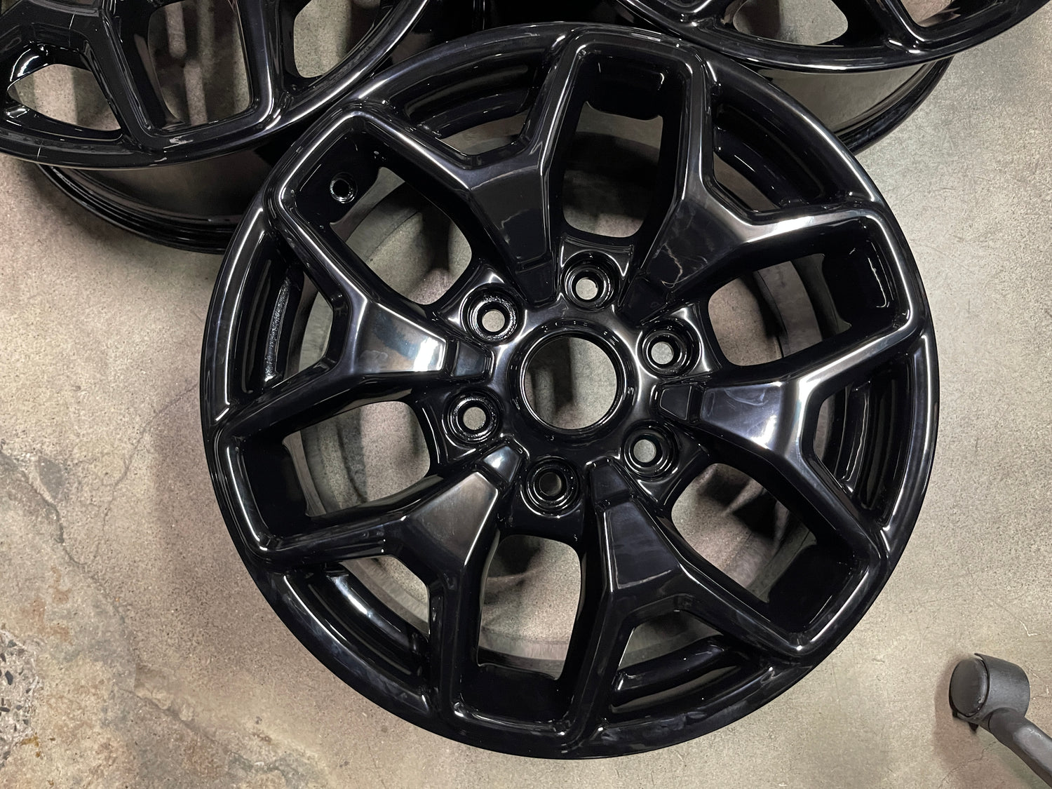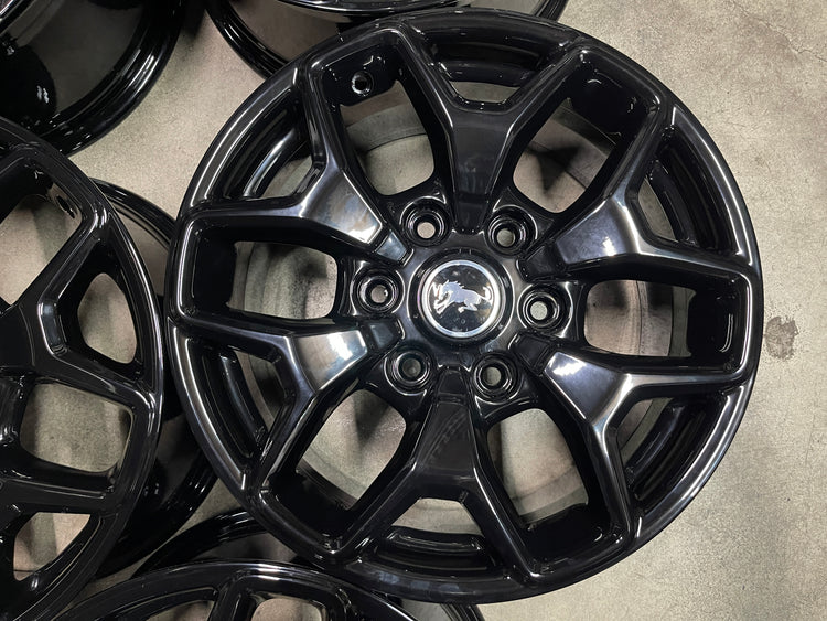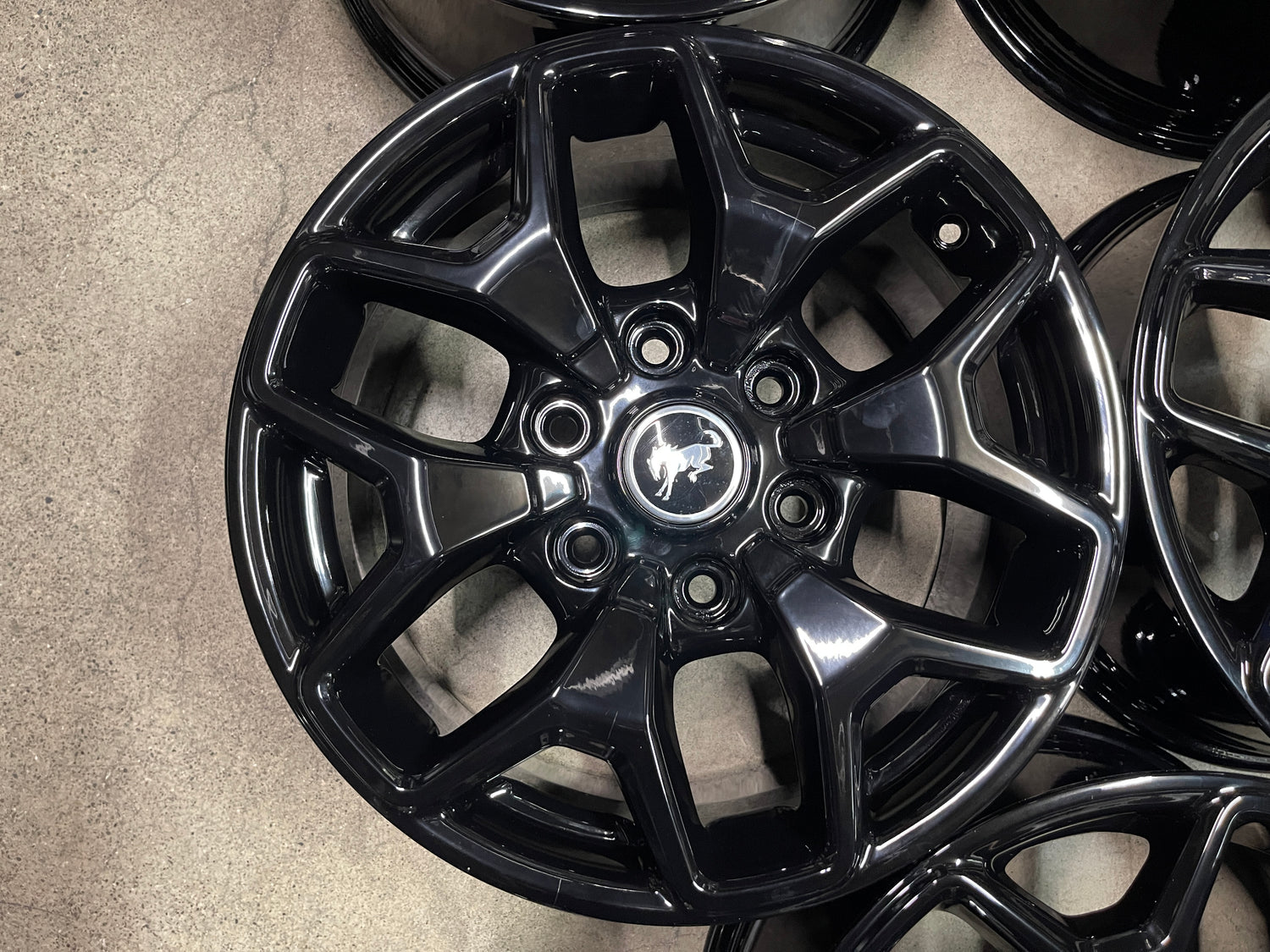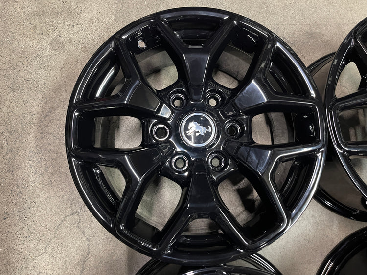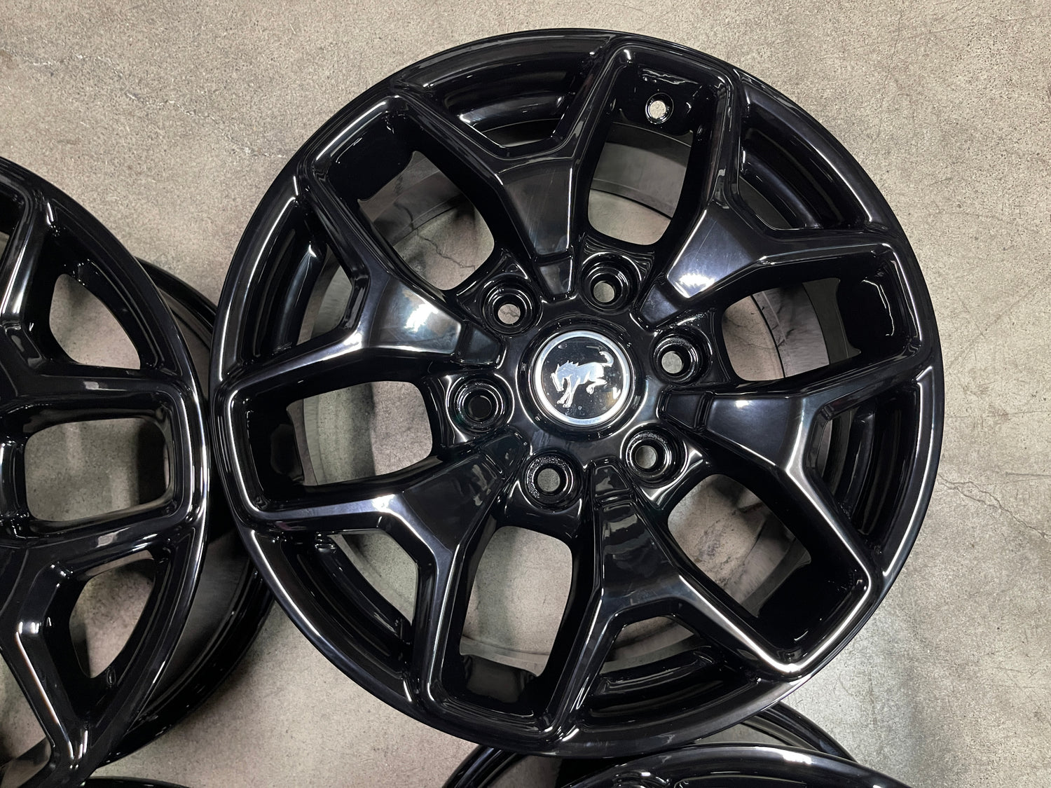 This is a set of Five (5) Take Off 2022 2023 2024 Ford Bronco Badlands 17 inch factory wheels. Refinished with a gloss black powder coat finish. 4 Caps included (spare does not have a cap), no sensors.
