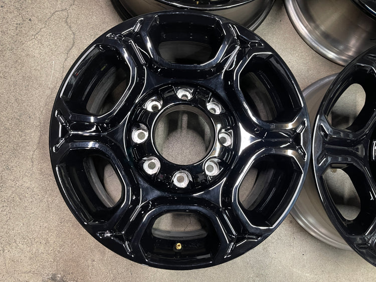 This is a take-off set of 2023 2024 2025 Ford F250 F350 Factory 18 wheels. OEM gloss black powder coat finish. OEM gloss black caps included (2 open and 2 closed for 4x4). NO sensors. Tall rear caps fit the 12 bolt rear axle.