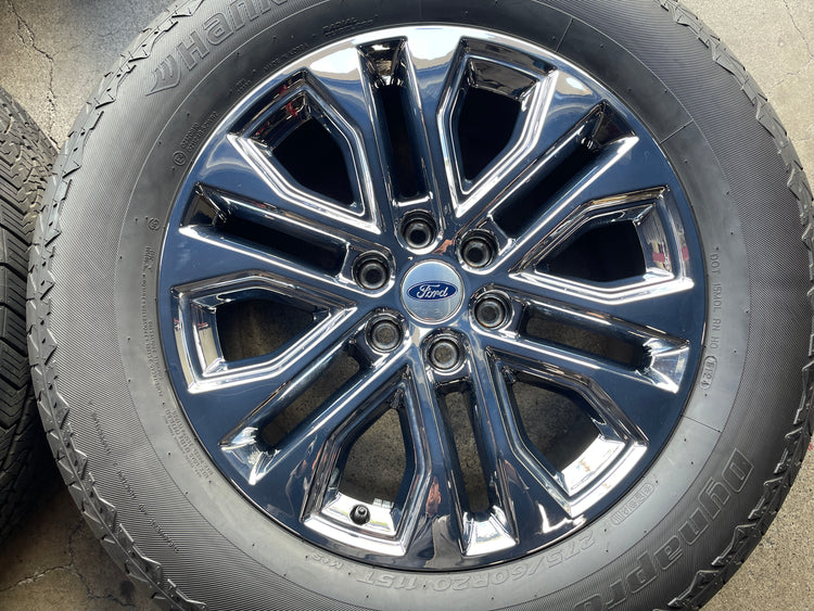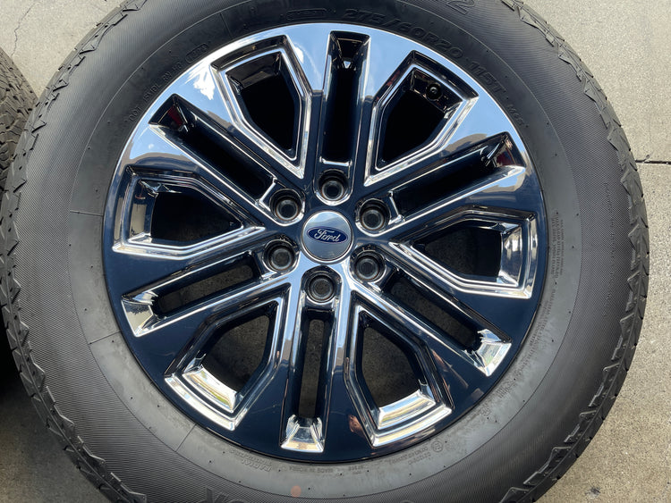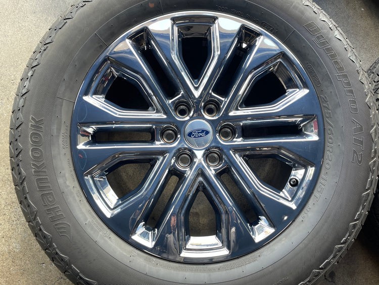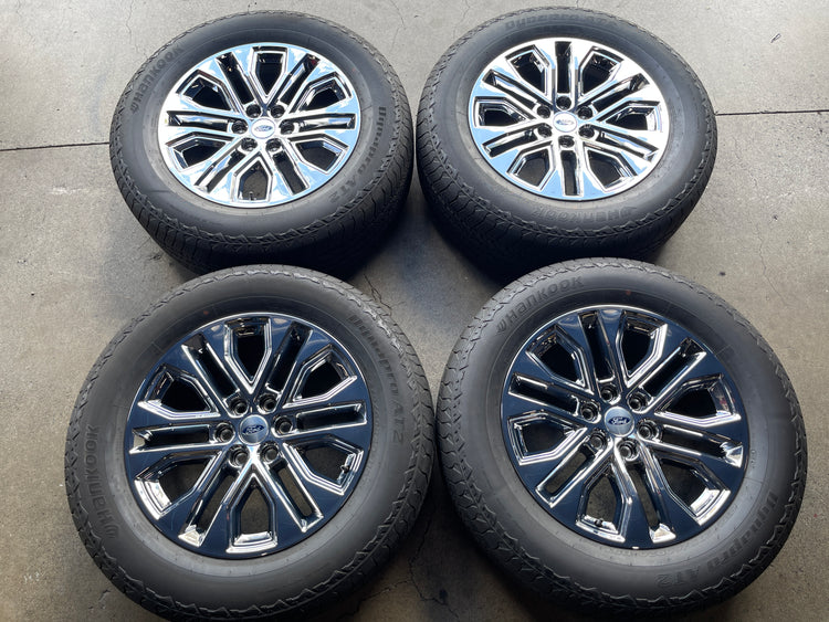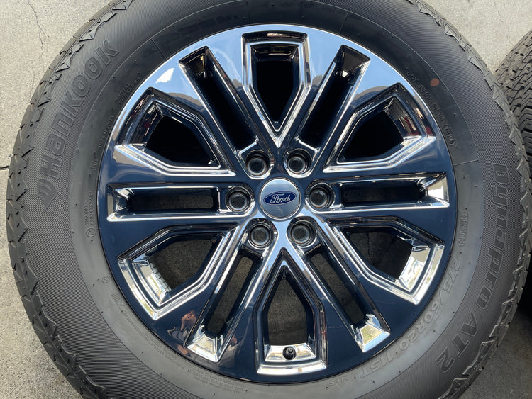 This is a Take off set of factory 2024 2025 Ford F150 Lariat 20 inch wheels and tires, OEM PVD Bright Chrome finish. Light scuffs. The Hankook Dynapro AT2 275/60TR20 tires have 99% tread remaining with a 1324 DOT. Caps included. No sensors. Fits your 2005 to 2025 F150. FX2 and FX4.