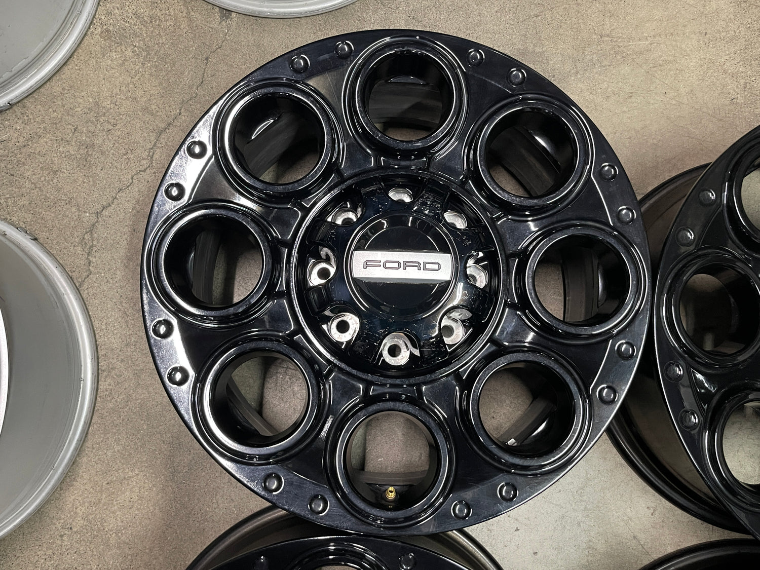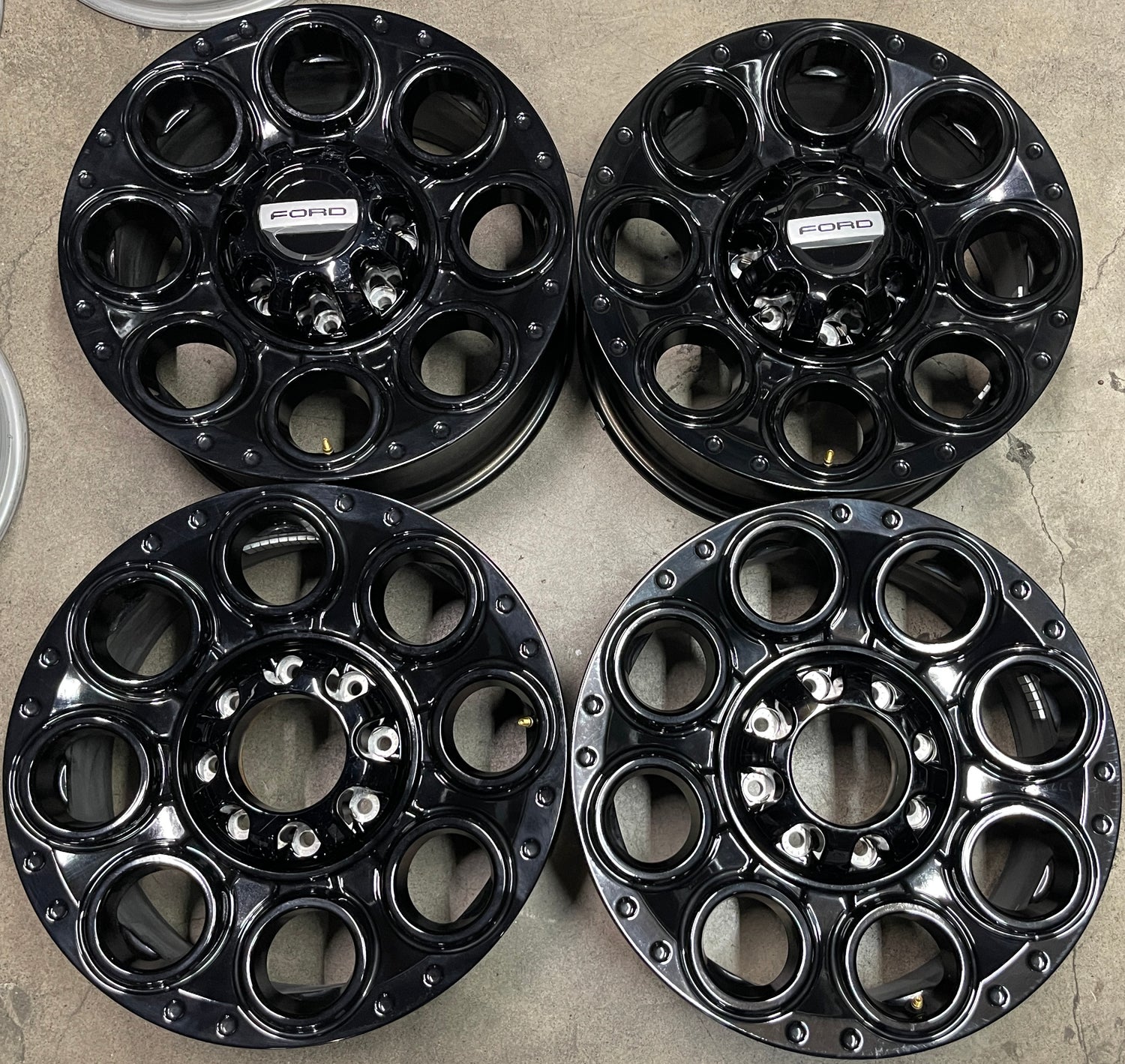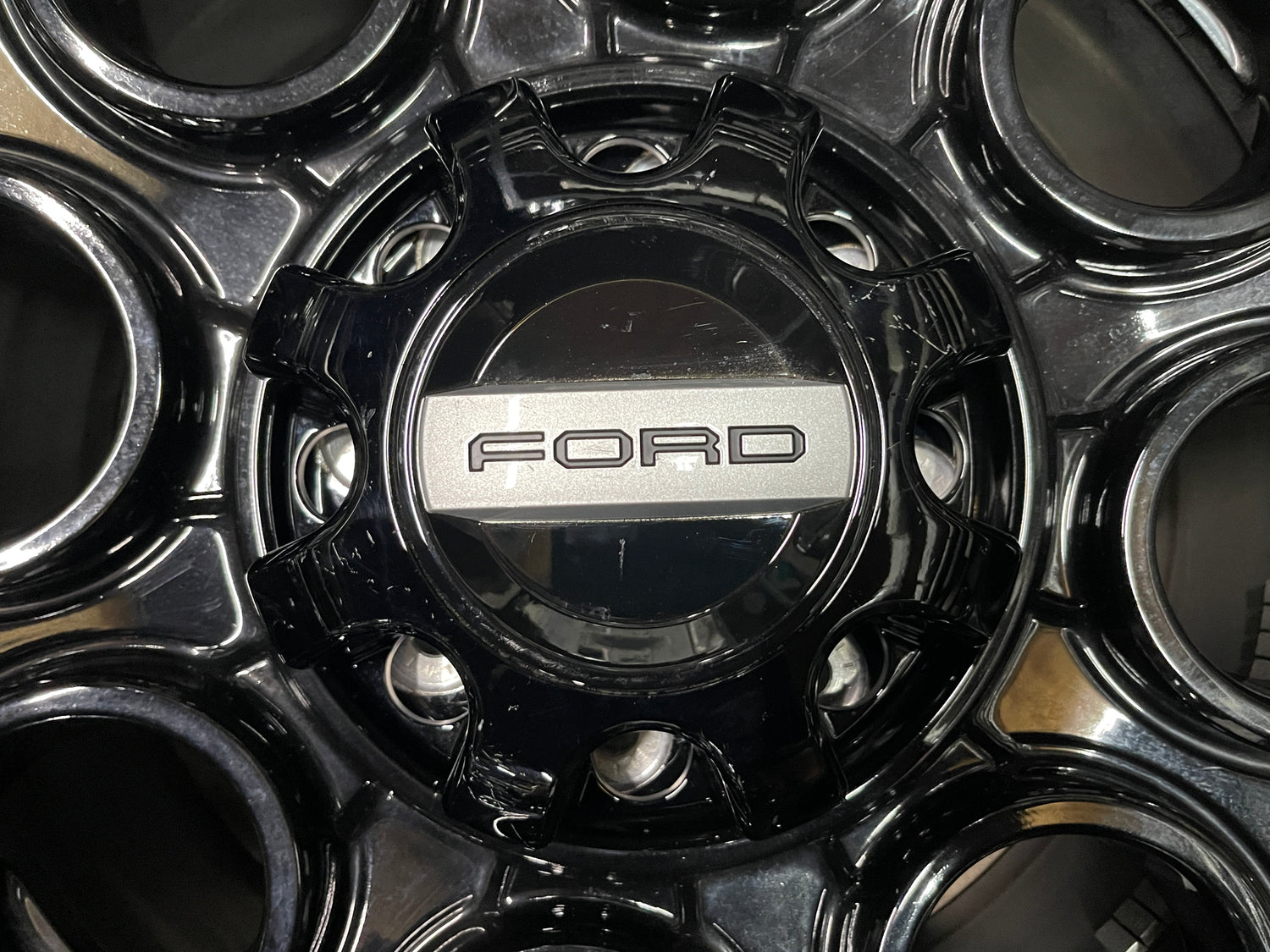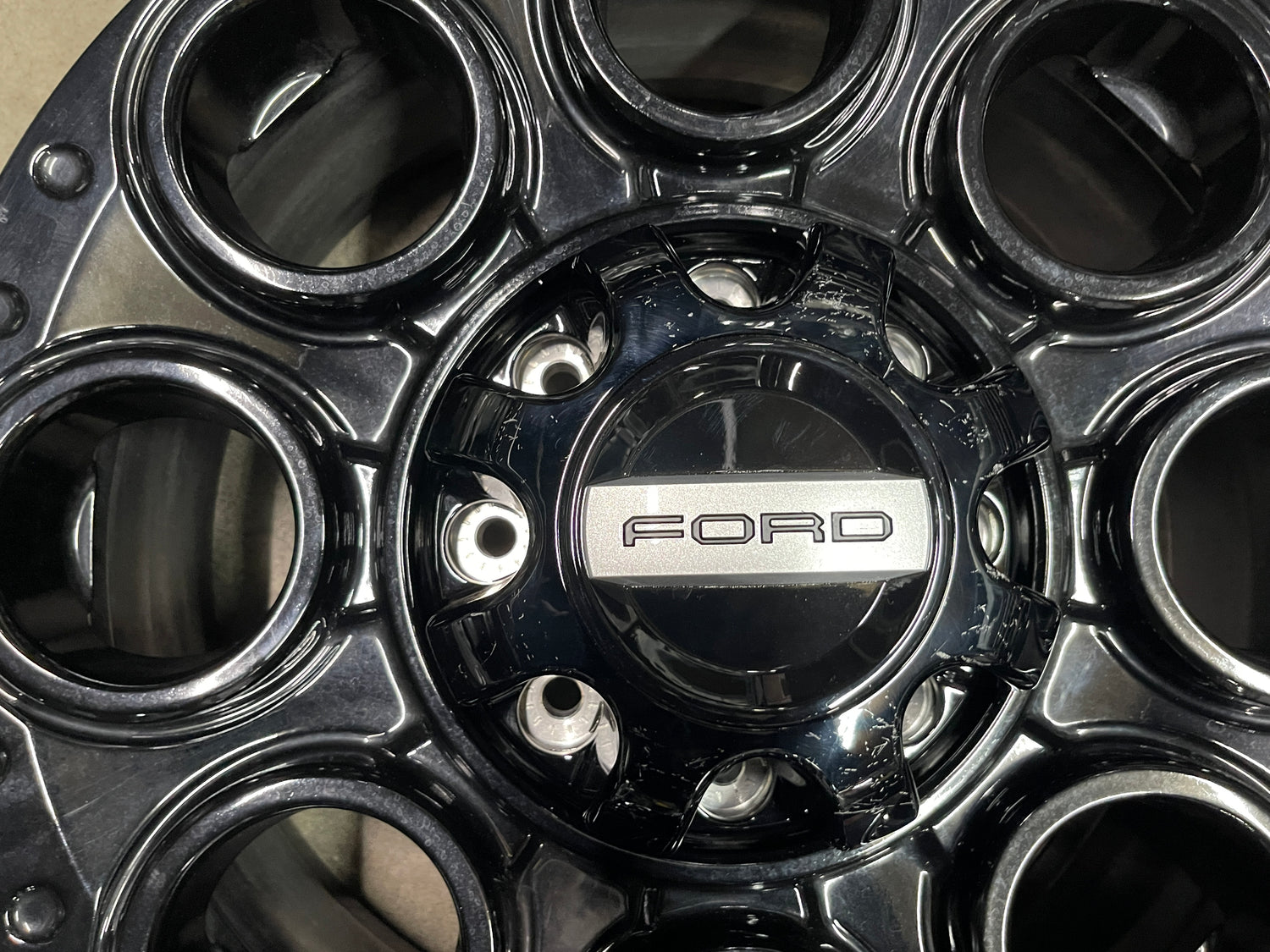 This is a clean Take Off set of factory 2023 2024 2025 F250 / F350 20 inch wheels. Tall rear caps included (2 open , 2 closed). No sensors, no lug nuts. NOTE: This set will fit the "12 bolt differential" rear axle due to the Tall rear caps.