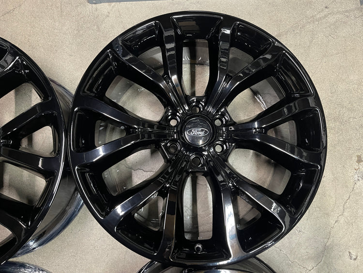 This is a set of factory 2015 2016 2017 2018 2019 2020 2021 2022 2023 2024 Ford Expedition 22 inch wheels refinished in Gloss Black powder coating. Caps included. NO sensors. Fits your 2015 to 20254 Expedition, F150.